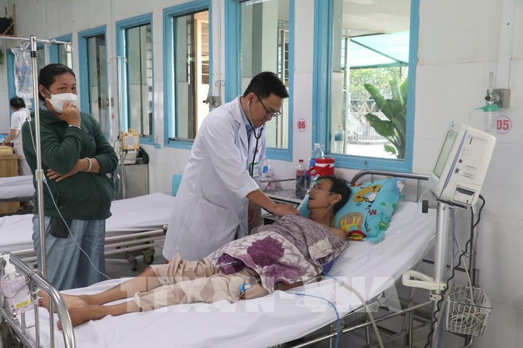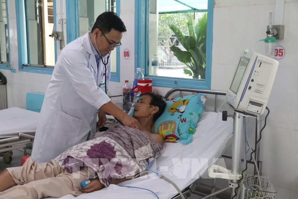 Bác sĩ Chuyên khoa I Đào Quang Vinh, Trưởng Khoa Hồi sức cấp cứu, Bệnh viện Đa khoa khu vực Cai Lậy, thăm khám cho bệnh nhân. Ảnh Công Trí-TTXVN
