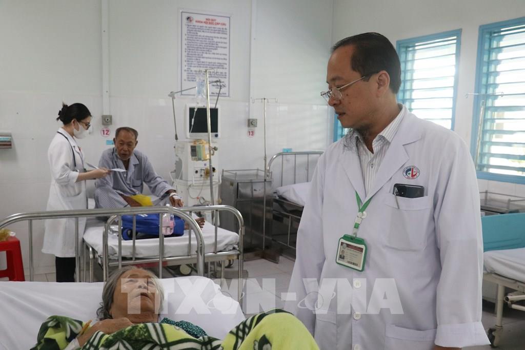 Bác sĩ chuyên khoa II Trần Văn Huyền, Phó Giám đốc Bệnh viện Đa khoa khu vực Cai Lậy thăm hỏi bệnh nhân đang điều trị. Ảnh: Công Trí-TTXVN