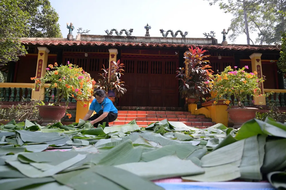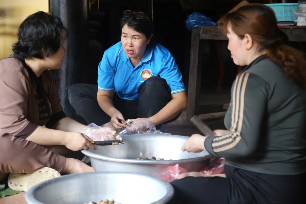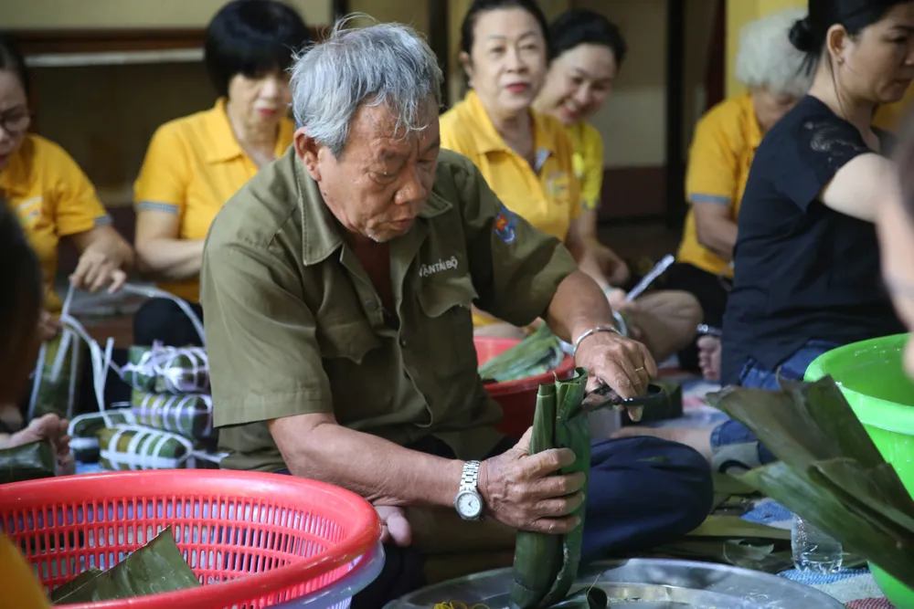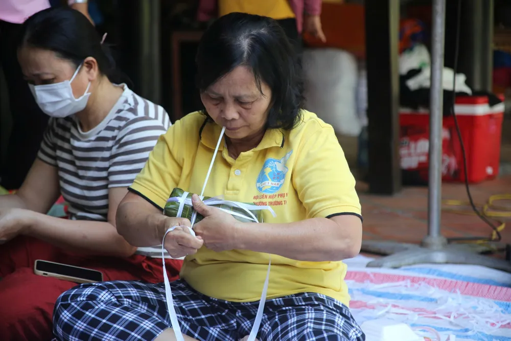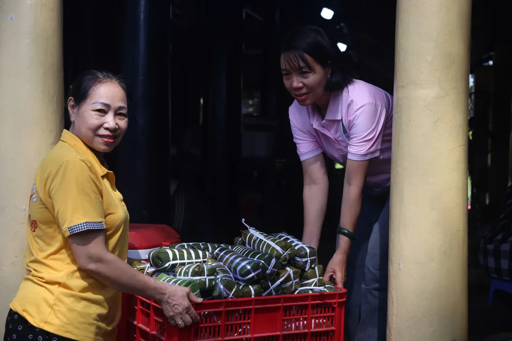 Từ cửa vào đến bên trong đình, ai cũng vội mà vui. Người vo gạo, người rửa lá, người tỉ mẩn gói từng đòn bánh chắc tay. Mọi người cố gắng làm thật nhanh để bánh kịp gửi đi, như muốn gửi theo đó cả tấm lòng đến miền Trung.