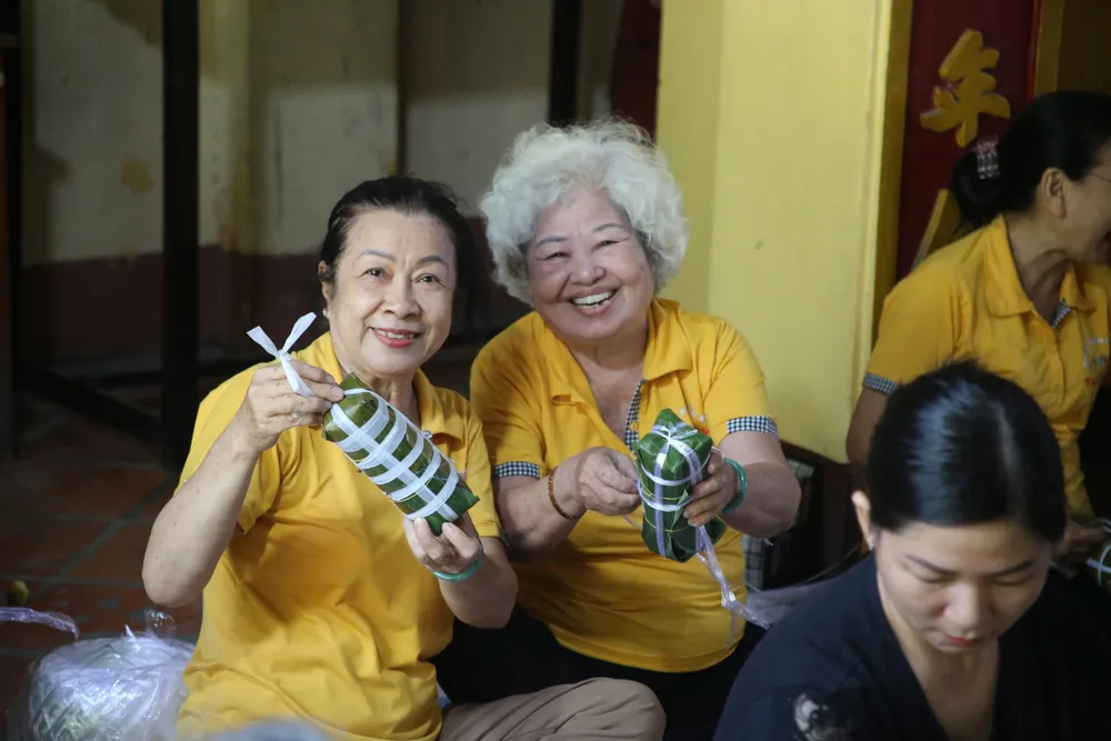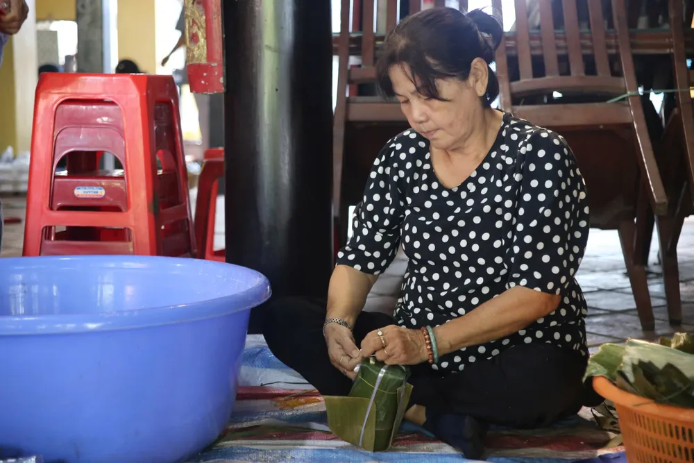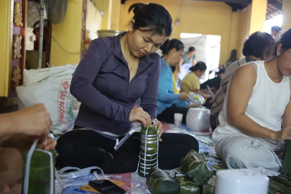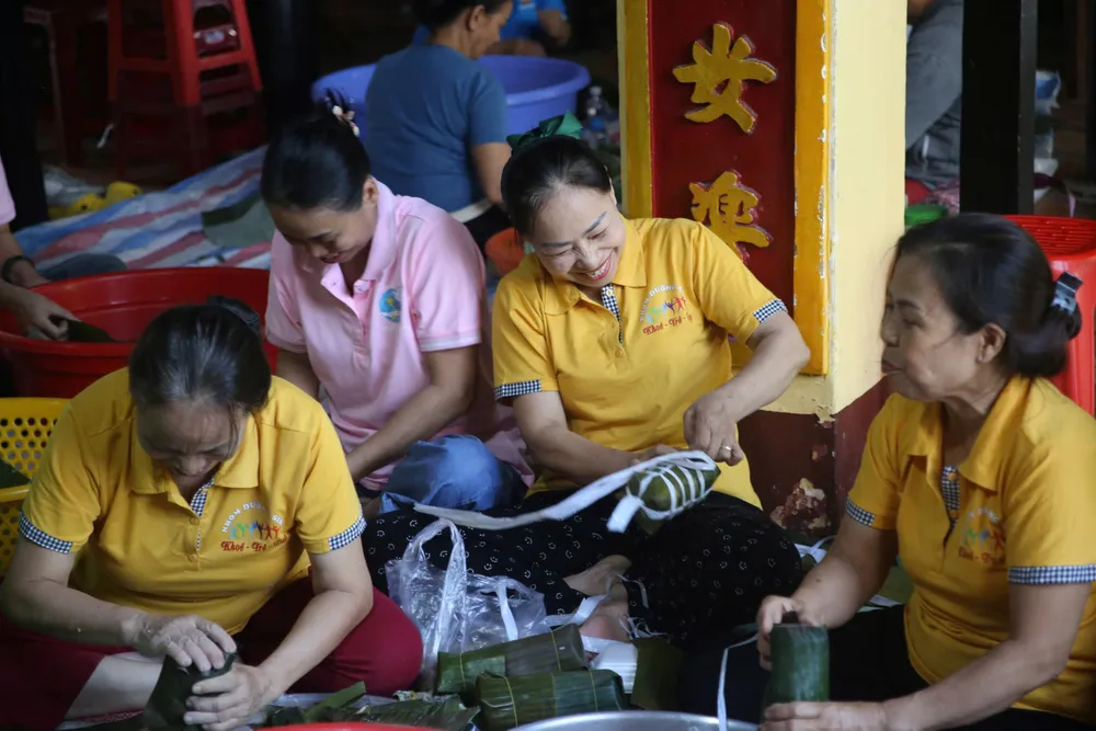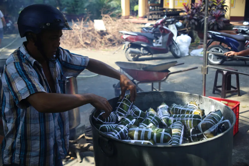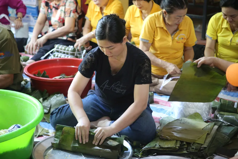 Không chỉ có chị em phụ nữ, các bác trung niên, người già, mà cả vợ chồng trẻ cũng dắt nhau đến phụ giúp. Có anh lo khiêng củi, có chị gói bánh, có em nhỏ phụ rửa lá, rửa dây, ai nấy đều bận rộn mà hạnh phúc. Nhìn cảnh cả cộng đồng cùng làm một việc ý nghĩa, người ta mới thấy sức mạnh của tình người lớn đến thế nào.