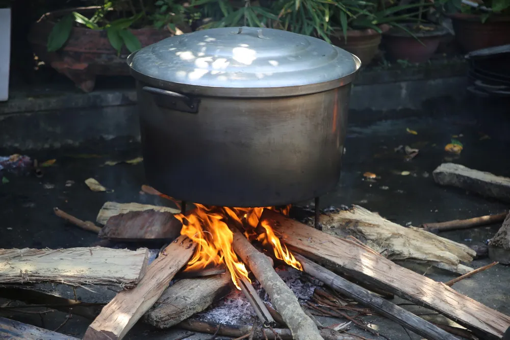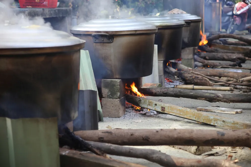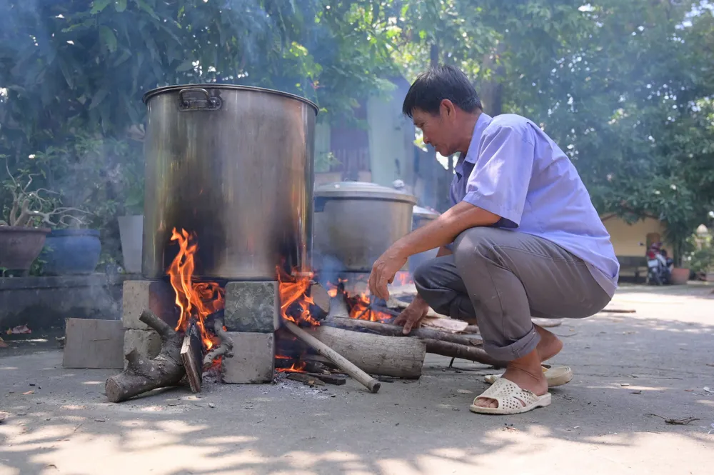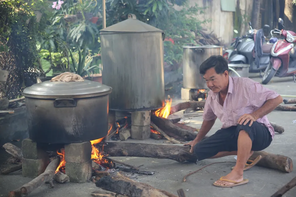 Dưới bóng cây trong sân đình, gần 10 nồi bánh tét đỏ lửa cháy rực suốt ngày đêm. Khói bếp quyện vào không khí, mùi lá chuối, mùi nếp thơm lan tỏa khiến ai đi ngang cũng ấm lòng. Những người đàn ông lớn tuổi thay phiên nhau trực bếp, châm nước, giữ lửa để bánh chín đều, ngon dẻo.