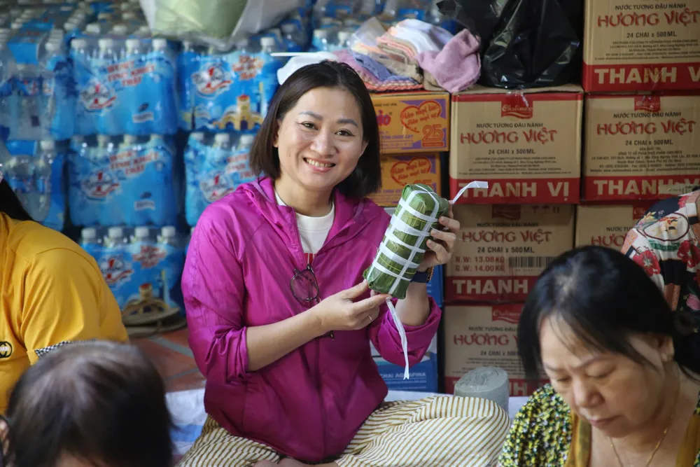 Chị Ninh Thị Hoa (áo hồng), Chi hội Hội Phụ nữ phường Thủ Đức, chia sẻ: “Những ngày qua nhìn cảnh bà con miền Trung lội trong nước lũ, nhà cửa trôi, tài sản mất… chúng tôi xót lắm. Chúng tôi nghĩ mình làm được gì thì làm, gói bánh tét gửi ra cho bà con chống đói, chống rét cũng là một cách”.
