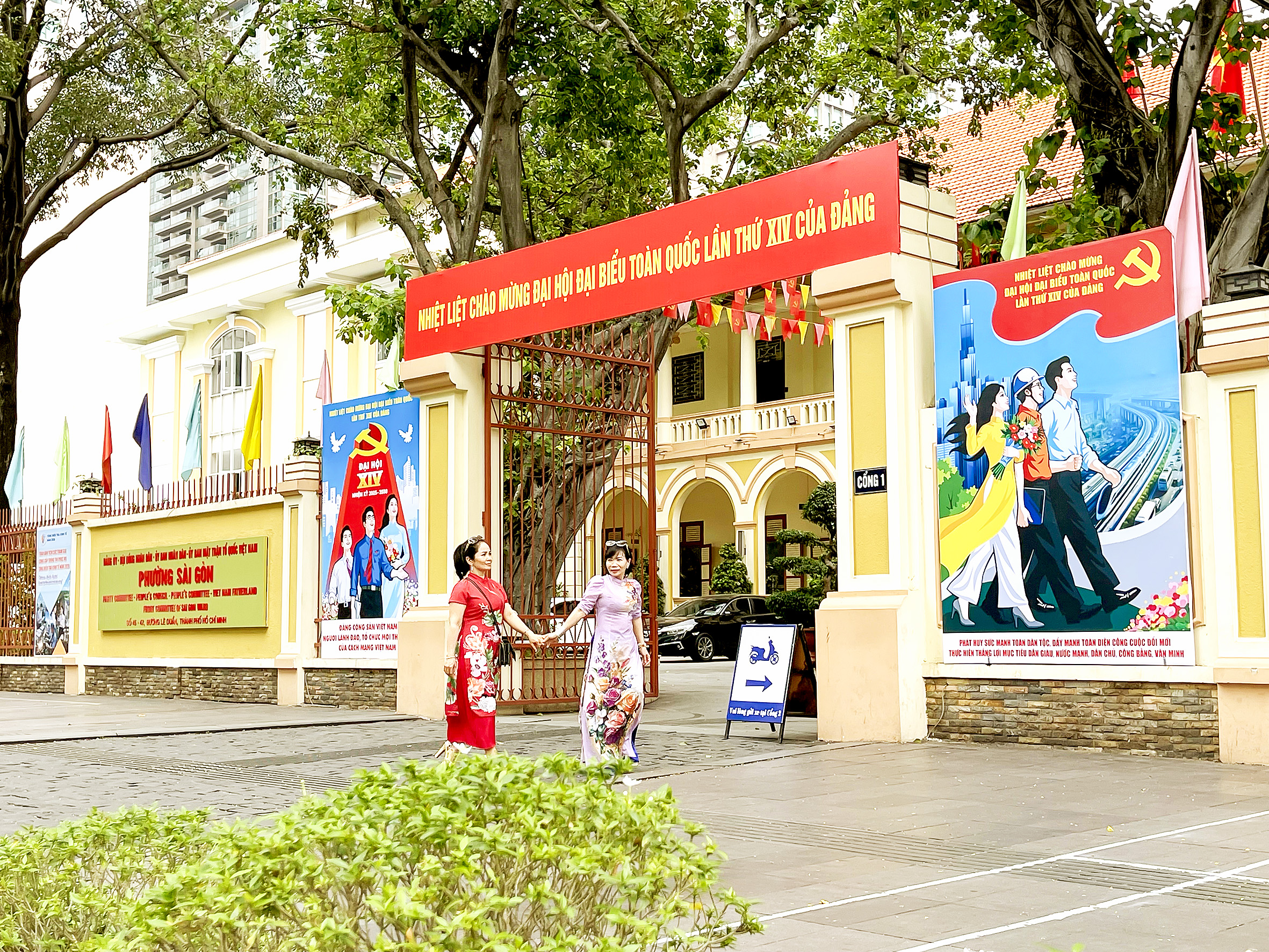 Người dân phường Sài Gòn, TPHCM chào mừng Đại hội XIV của Đảng. Ảnh: HOÀNG HÙNG