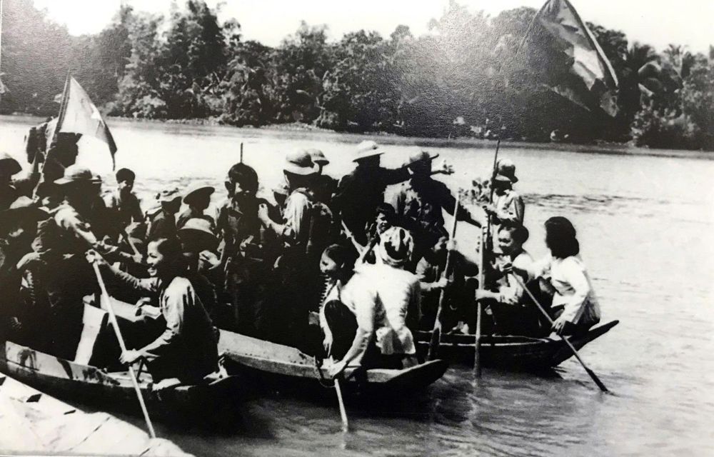 Lực lượng cách mạng và Nhân dân Mỹ Hiệp đưa bộ đội vào chiến dịch mùa Xuân năm 1975 – góp phần làm nên thắng lợi lịch sử giải phóng quê hương. Ảnh: Khu Di tích Xẻo Quít