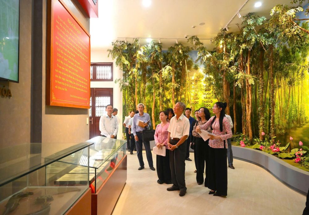 Đồng chí Nguyễn Đắc Hiền, nguyên Phó Bí thư Thường trực Tỉnh ủy Đồng Tháp tham quan Nhà trưng bày Khu di tích Xẻo Quít - nơi từng là căn cứ của Tỉnh ủy Kiến Phong trong kháng chiến. Ảnh: Khu Di tích Xẻo Quýt