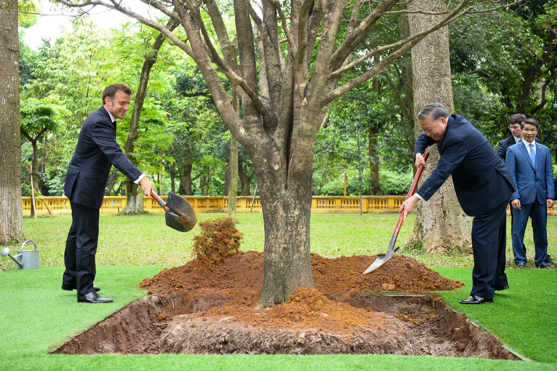 Tổng Bí thư Tô Lâm cùng Tổng thống Emmanuel Macron trồng cây mộc hương trong Khu di tích Chủ tịch Hồ Chí Minh