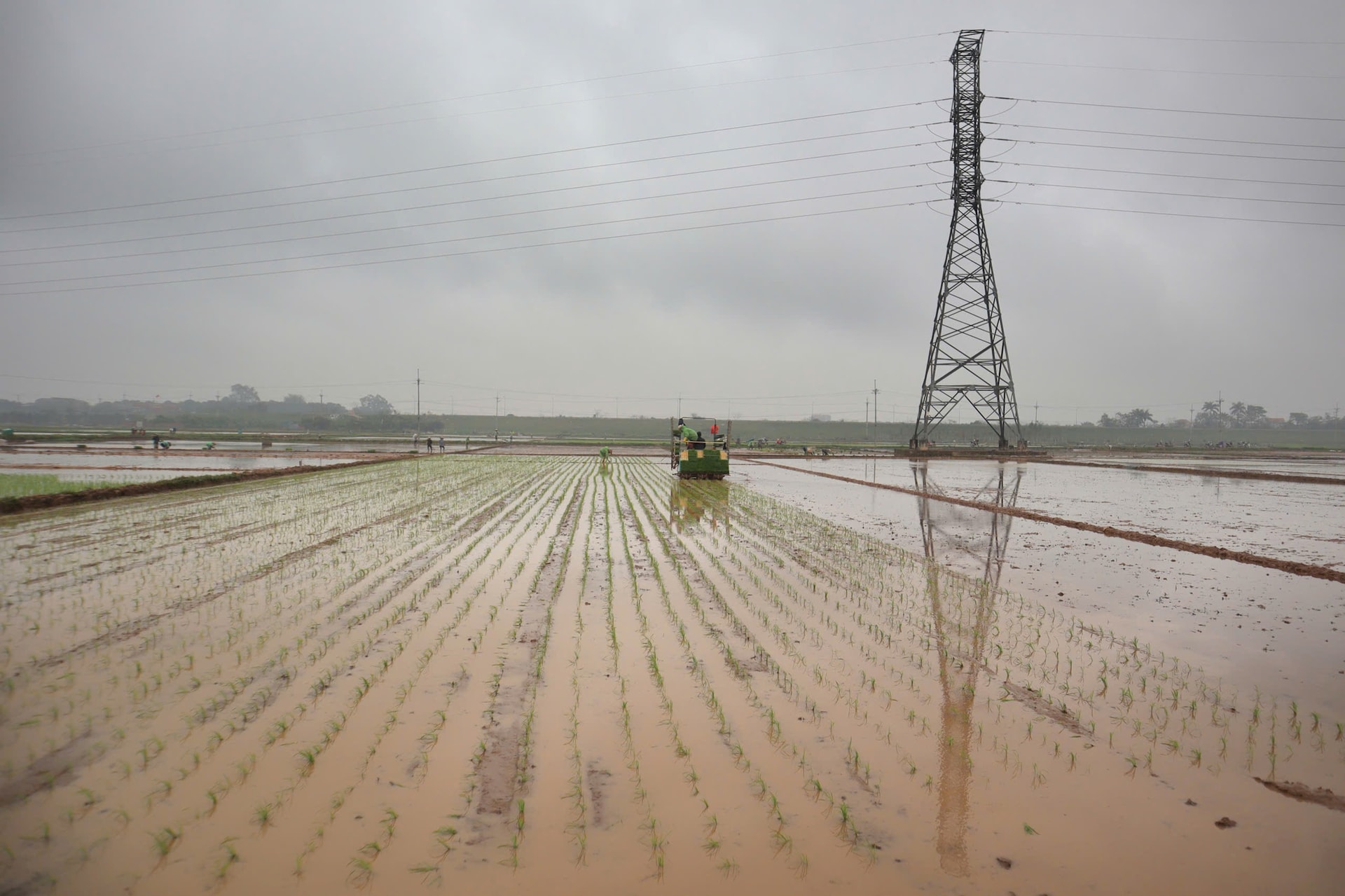 Tại cánh đồng khu vực Liên Hiệp, ruộng được bừa đến đâu, máy cấy xuống giống ngay tới đó. Ảnh: Minh Phú