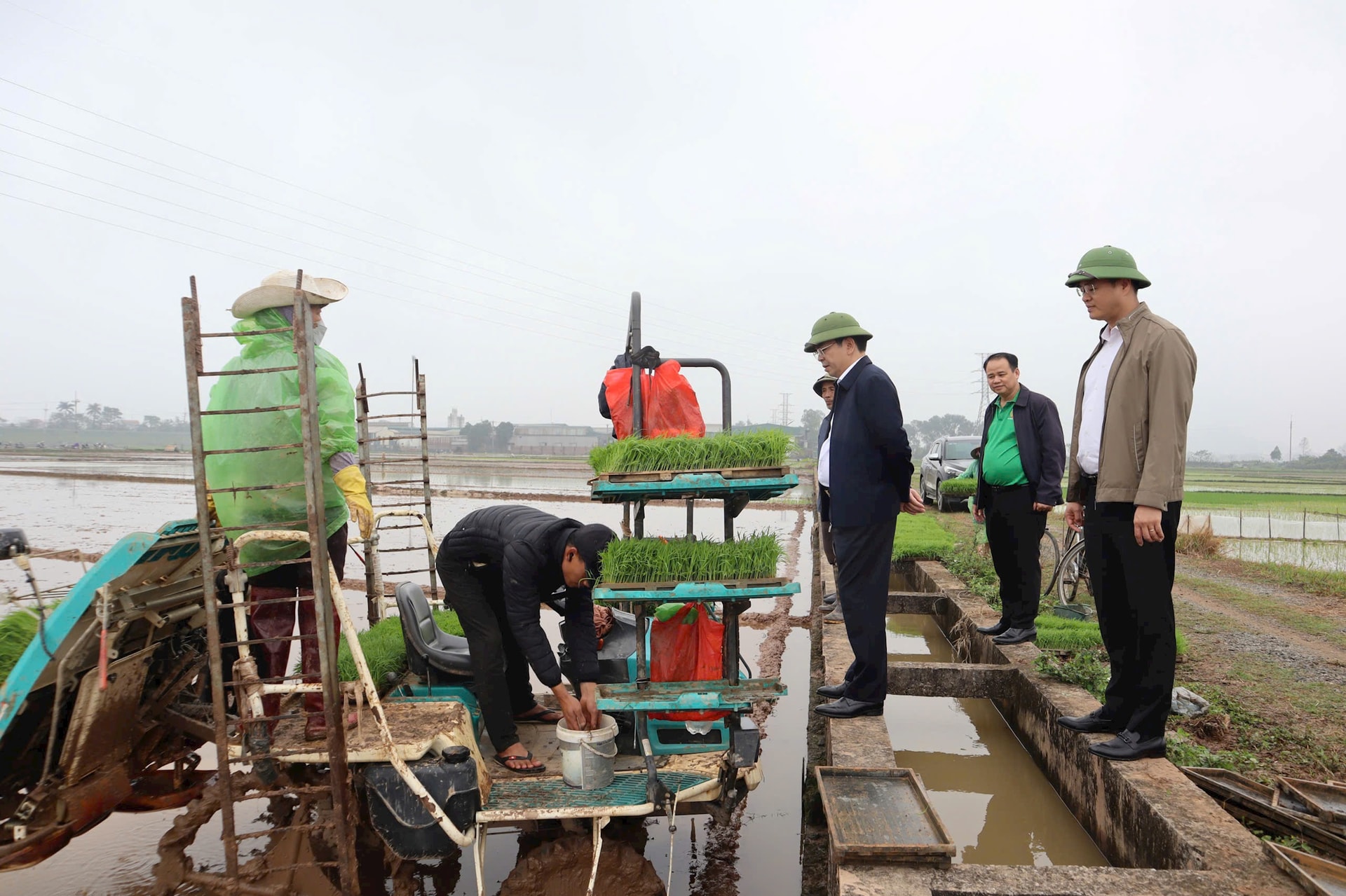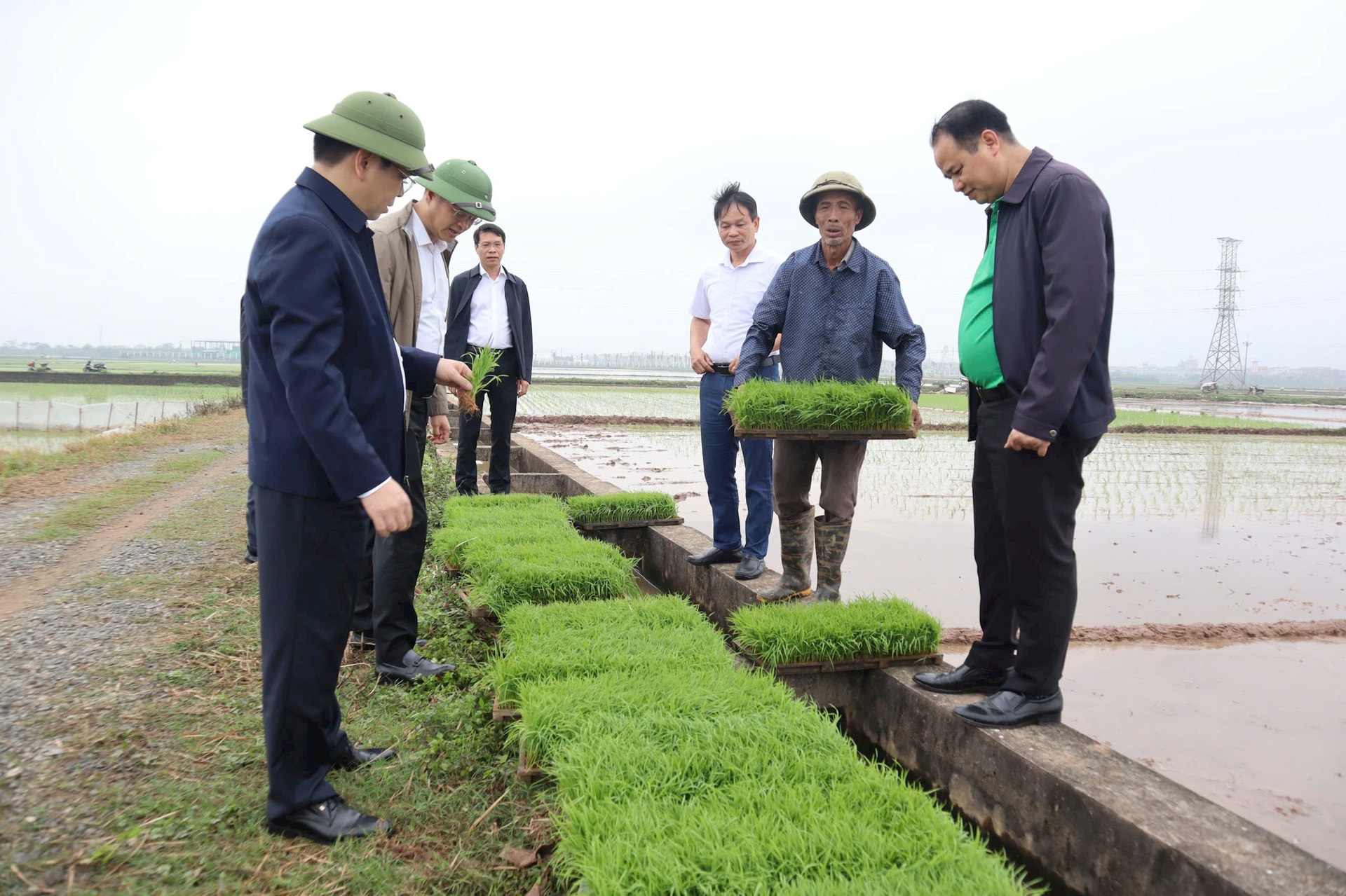 Lãnh đạo xã Hát Môn thăm, động viên nông dân và kiểm tra tiến độ sản xuất vụ xuân trên cánh đồng khu vực Liên Hiệp. Ảnh: Minh Phú