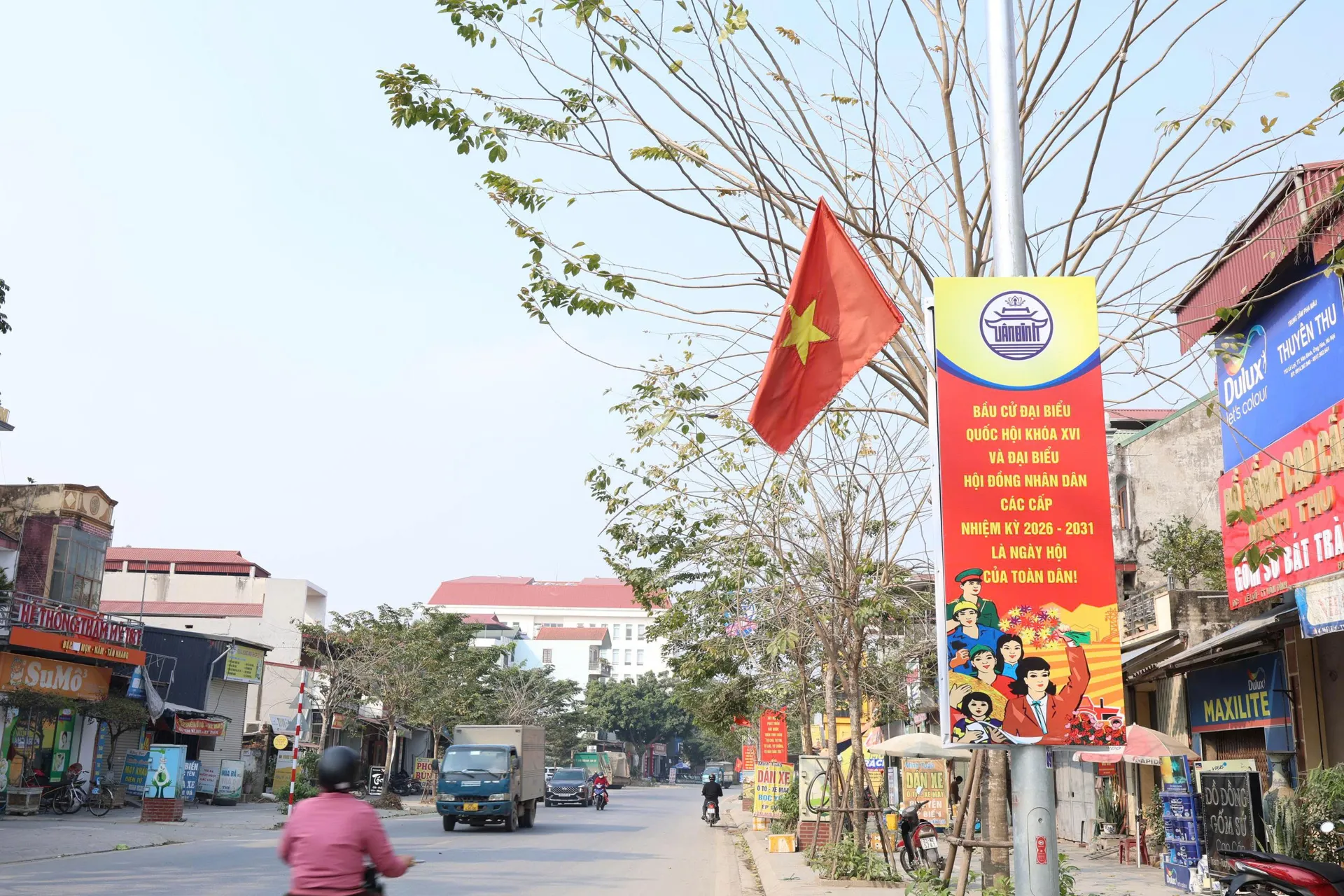 Pano, cờ Tổ quốc tuyên truyền bầu cử đại biểu Quốc hội khóa XVI và đại biểu Hội đồng Nhân dân các cấp được treo trên các tuyến đường xã Vân Đình.