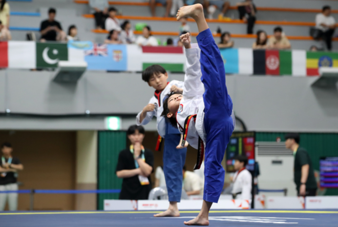 Các vận động viên tiểu học biểu diễn trong Lễ hội Taekwondo Đại học Thế giới Daegu 2025 tại cơ sở Seongseo của Đại học Keimyung ở quận Dalseo, Daegu, ngày 6/7/2025. Ảnh: Korea JoongAng Daily