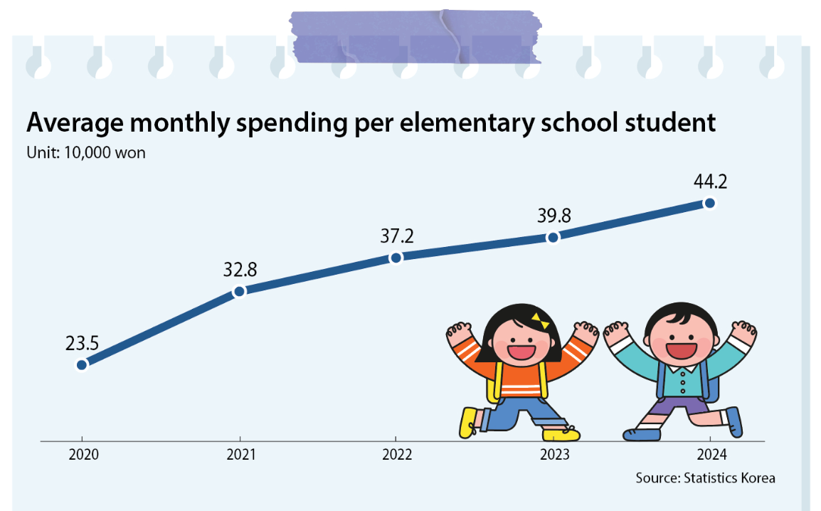 Học sinh tiểu học hiện là nhóm đóng góp nhiều nhất cho thị trường giáo dục tư thục Hàn Quốc. Năm 2024, tổng chi tiêu cho học thêm đạt 29,2 nghìn tỷ won, tăng 7,7% so với năm trước, dù số lượng học sinh giảm 80.000 em. Trong đó, riêng tiểu học chiếm tới 13,2 nghìn tỷ won, vượt xa trung học phổ thông (8,1 nghìn tỷ won) và trung học cơ sở (7,8 nghìn tỷ won).