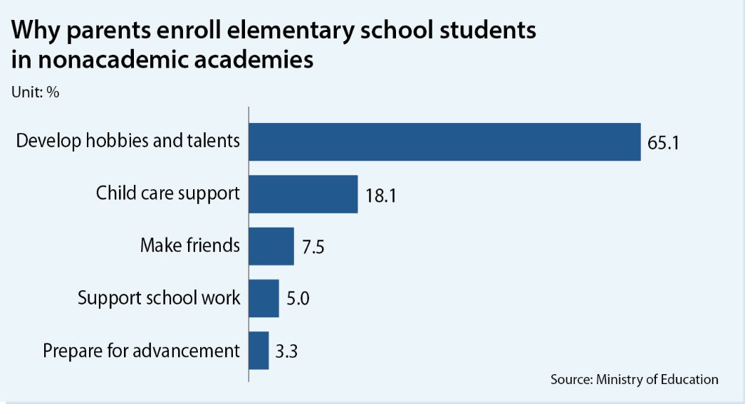 Lý do phụ huynh đăng ký cho con em mình học các môn ngoại khóa, với 65,1% mong muốn nuôi dưỡng đam mê và phát triển tài năng cho con, 18,1% vì lí do hỗ trợ trông trẻ. Ảnh: Korea JoongAng Daily