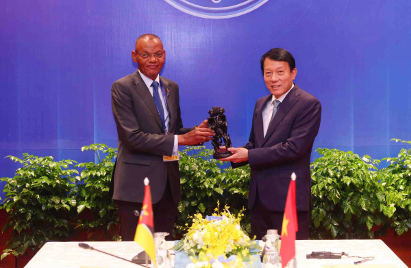 Bộ trưởng Paulo Chachine tặng quà lưu niệm Bộ trưởng Lương Tam Quang.