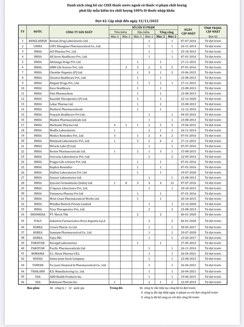 Danh sách 46 công ty thuốc nước ngoài vi phạm phải kiểm tra 100% lô hàng
