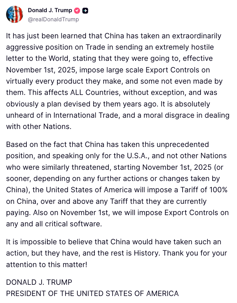 Động thái này xuất hiện chỉ ít giờ sau khi ông Trump cảnh báo sẽ hủy cuộc gặp dự kiến với Chủ tịch Trung Quốc Tập Cận Bình có thể diễn ra bên lề Diễn đàn Hợp tác Kinh tế châu Á – Thái Bình Dương (APEC) ở Hàn Quốc. “Chính sách về đất hiếm mà Trung Quốc đưa ra mang tính thù địch, gây khó khăn cho hầu hết các quốc gia trên thế giới”, ông Trump viết, đồng thời nhận định “không còn lý do” để duy trì cuộc gặp với ông Tập.