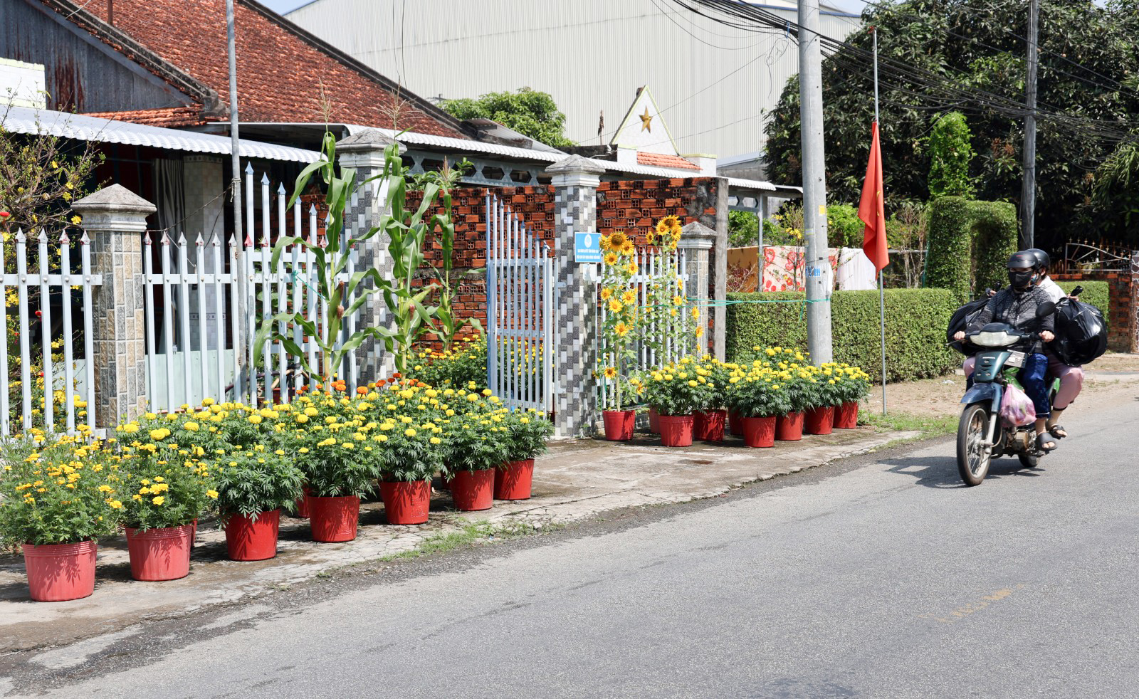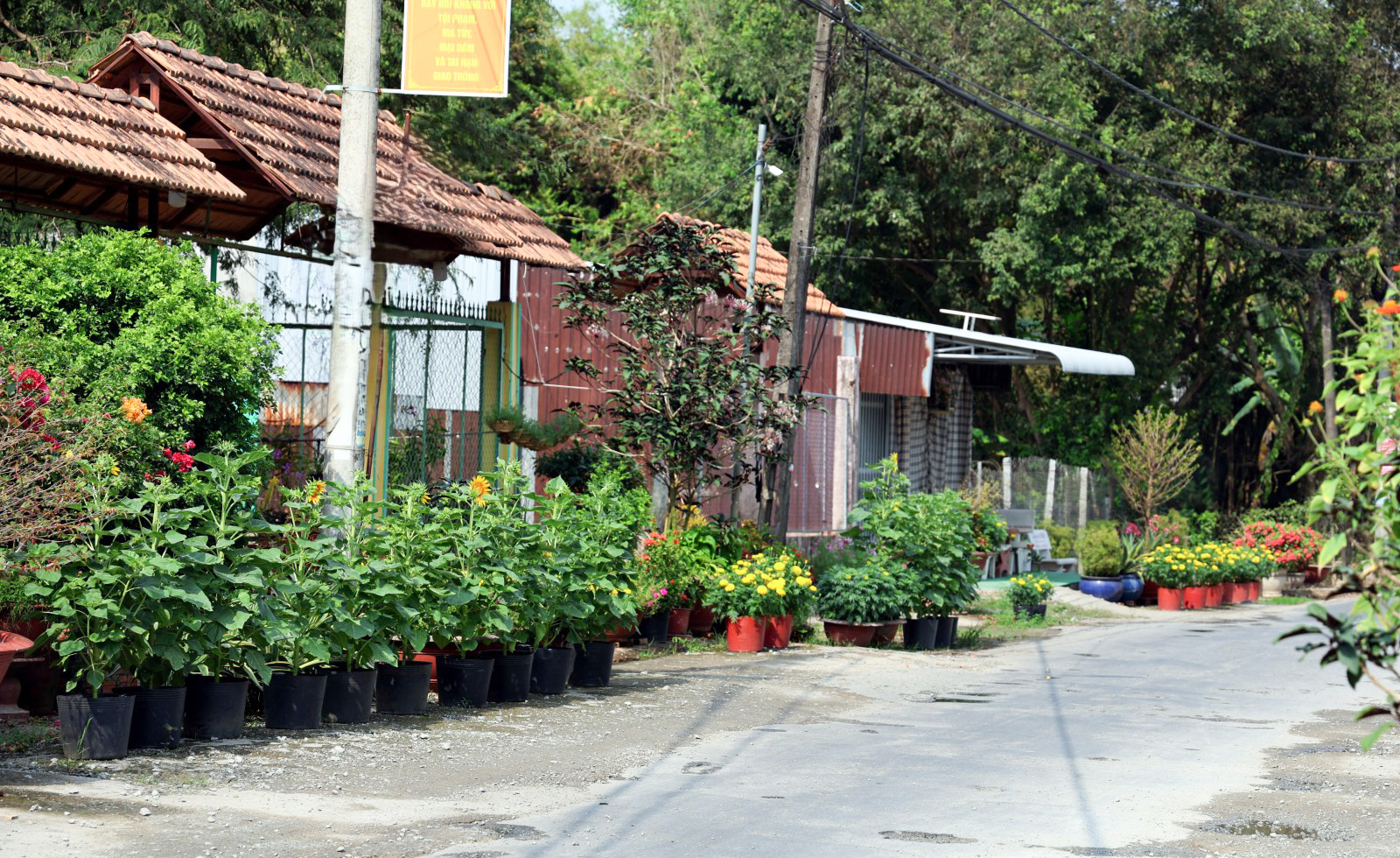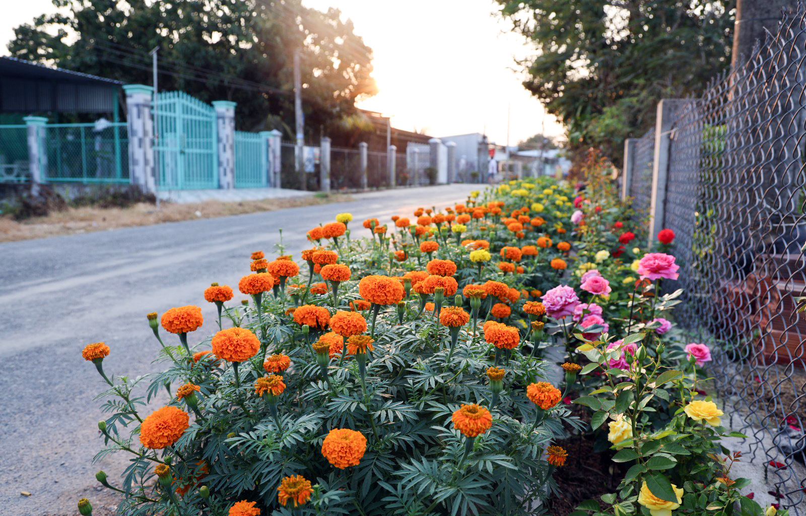 Hoa "nhà trồng" rực rỡ một đoạn đường quê.