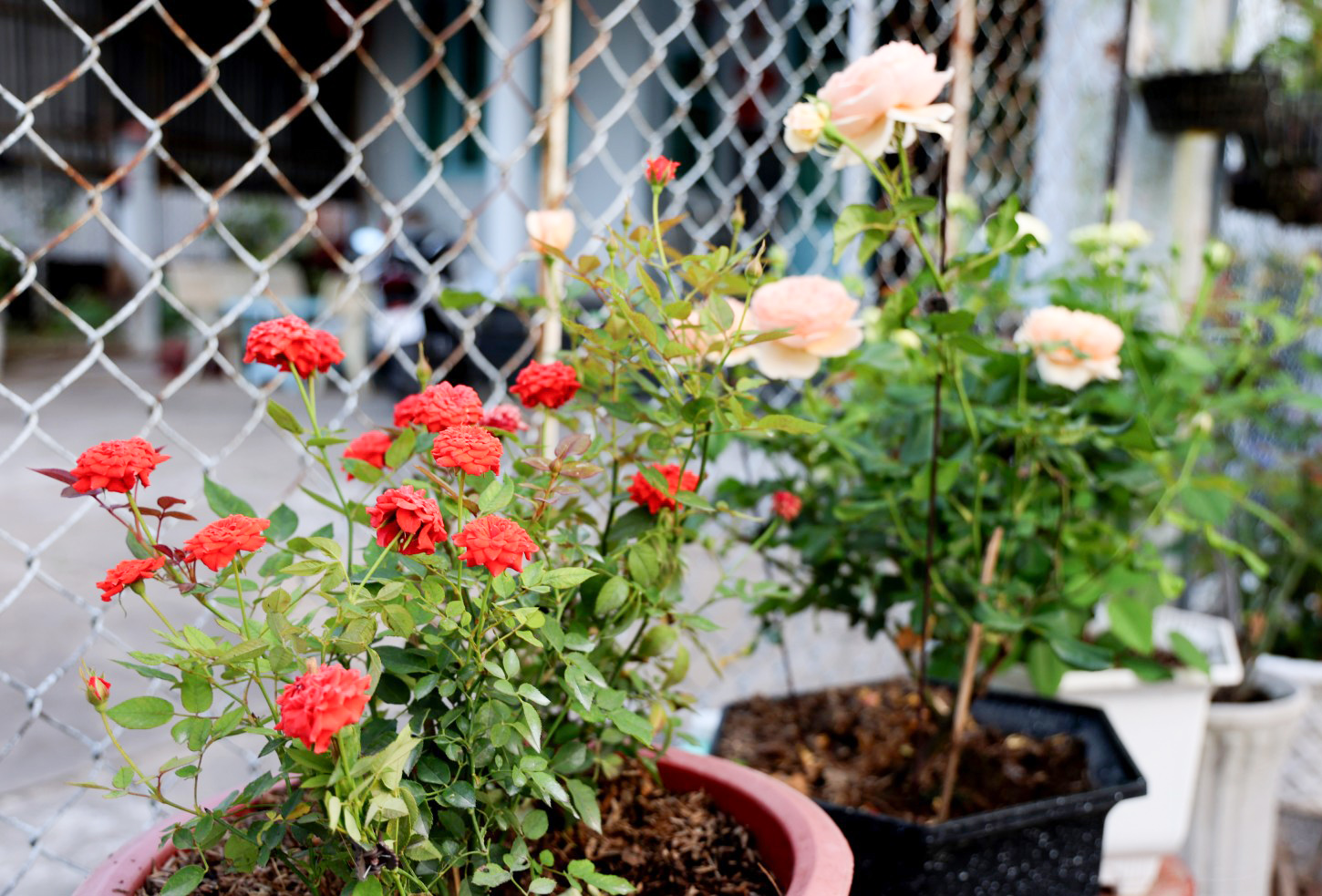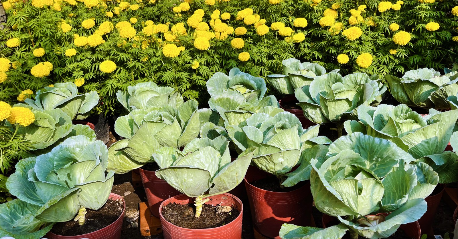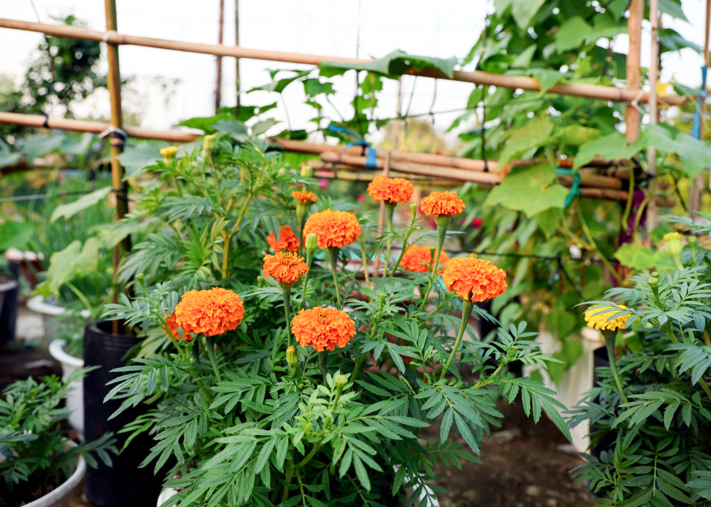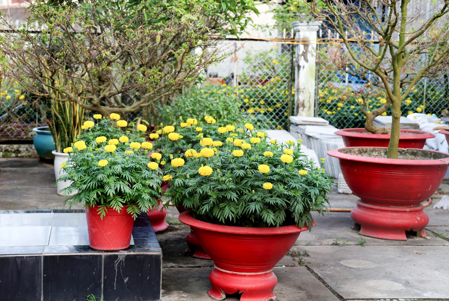 Mấy chậu bông bạn thọ đã kịp khoe sắc bên cạnh dàn dưa leo, đậu rồng.