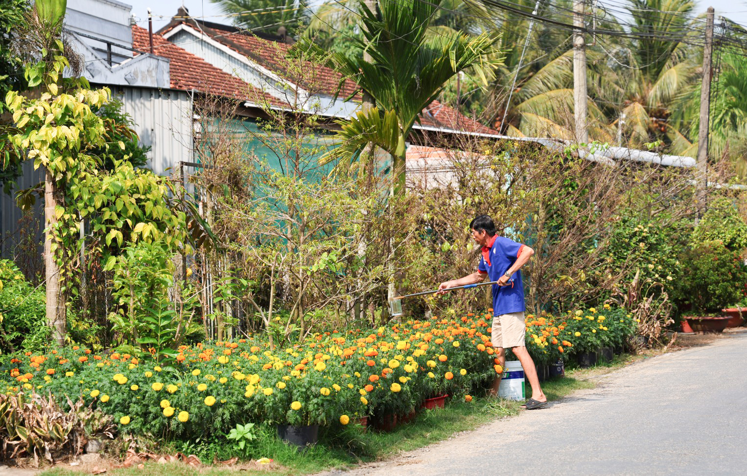Cuối năm, dạo quanh những nẻo đường quê, thật khó phân biệt đâu là hoa nhà trồng để trưng, đâu là hoa bán. Có nhà trước sân chất kín hoa, chờ gia chủ lại tỉ mẩn chia từng cặp tặng họ hàng, chòm xóm như trao đi cái tình ngày tết.