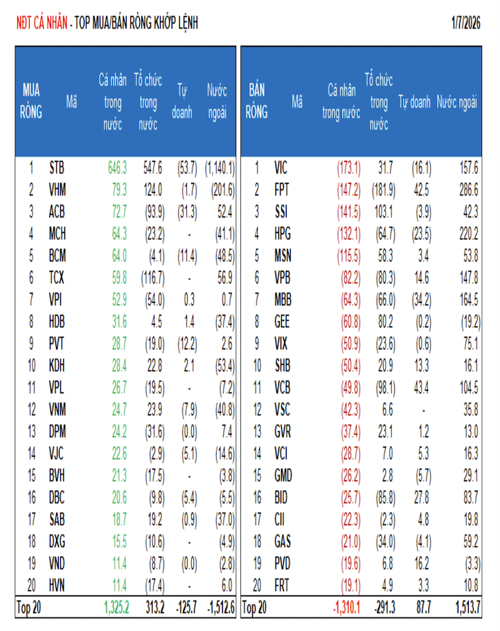 Tính riêng giao dịch khớp lệnh, họ mua rồng 7/18 ngành, chủ yếu là ngành Ngân hàng. Top mua ròng của nhà đầu tư cá nhân tập trung gồm: STB, VHM, ACB, MCH, BCM, TCX, VPI, HDB, PVT, KDH.