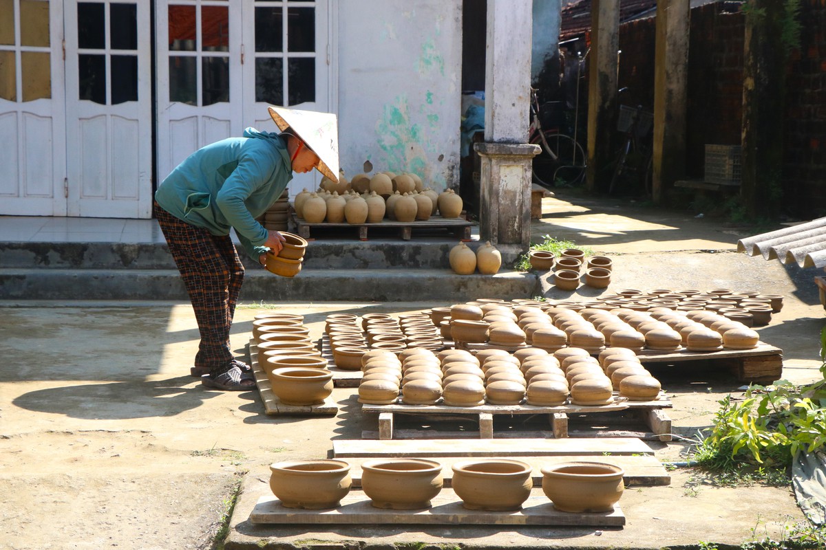 Người phụ nữ làng gốm Thanh Hà cẩn thận phơi từng sản phẩm gốm trong nắng xuân.