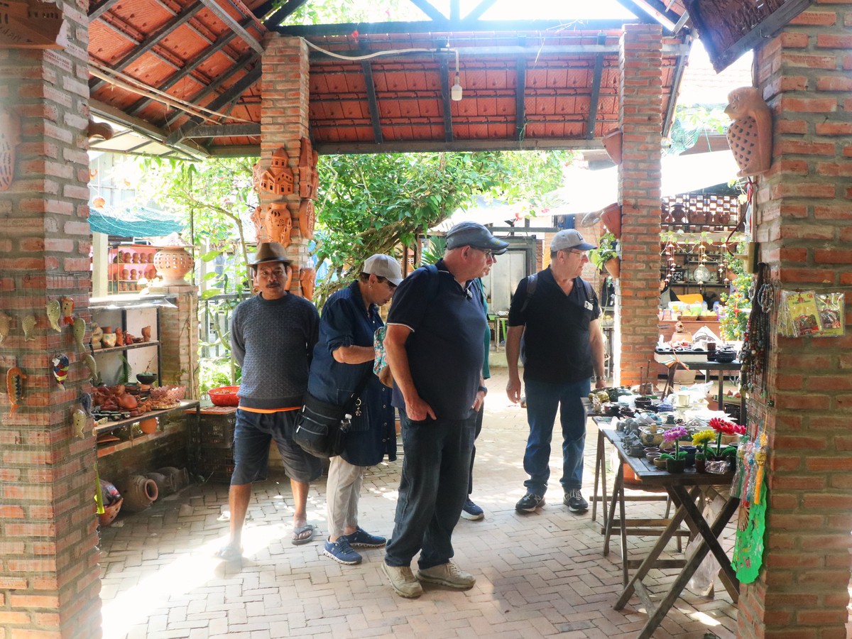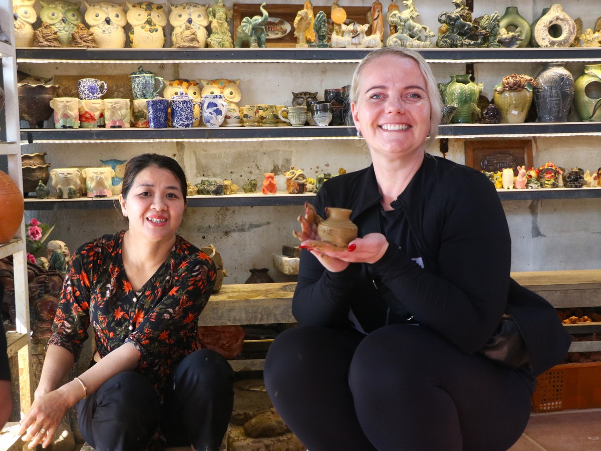 Mỗi ngày, cơ sở của chị đón nhiều đoàn khách quốc tế, từ tham quan đến trải nghiệm làm gốm, tạo nguồn thu ổn định cho gia đình.