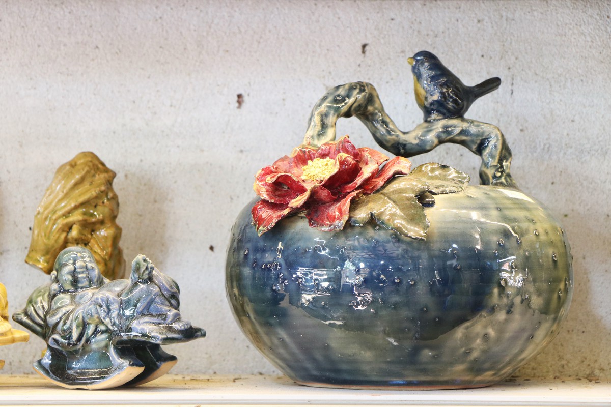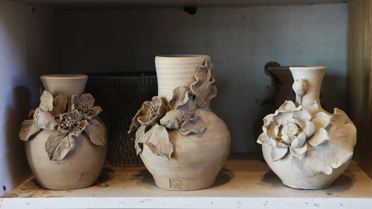 Sản phẩm gốm đắp nổi 3D của chị Nhung kết hợp kỹ thuật truyền thống với tư duy sáng tạo hiện đại, tạo chiều sâu thị giác và tăng tính ứng dụng cho gốm Thanh Hà.