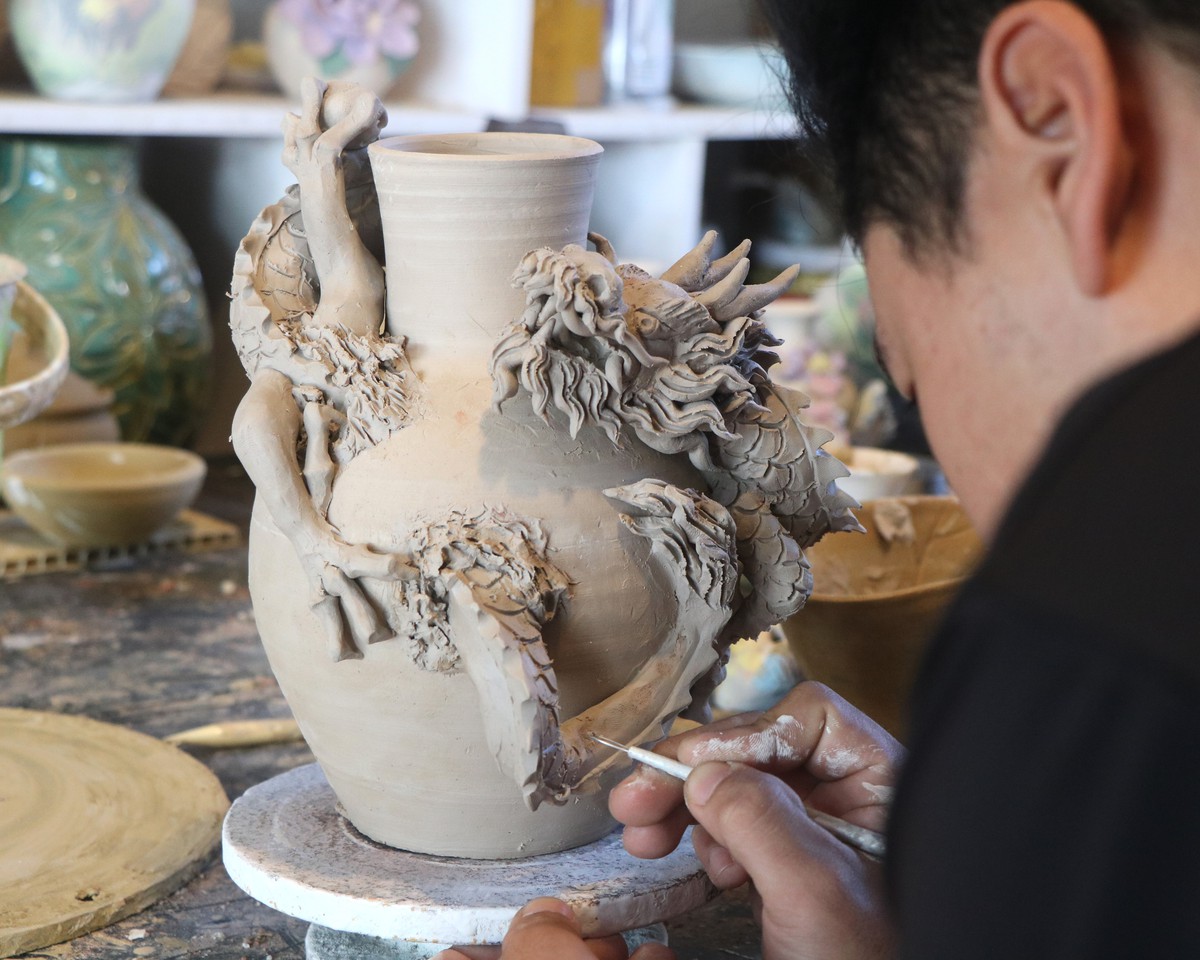 Sản phẩm gốm đắp nổi 3D hình rồng với đường nét uốn lượn tinh xảo, kết hợp kỹ thuật truyền thống và tư duy tạo hình hiện đại tại cơ sở gốm Sơn Thúy tạo điểm nhấn mới cho gốm Thanh Hà.