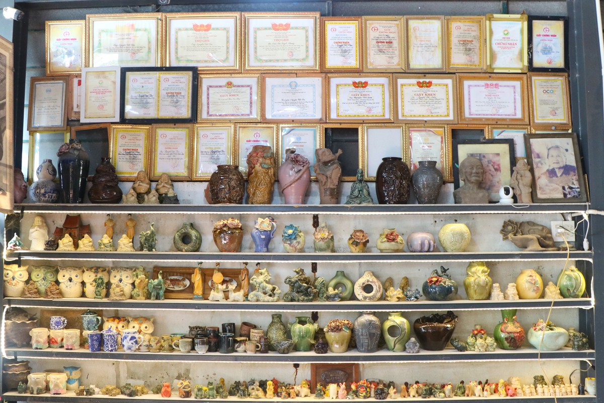Không gian trưng bày gốm của gia đình chị Trần Thị Tuyết Nhung, nơi những sản phẩm thủ công được sắp đặt hài hòa bên các giấy khen, chứng nhận OCOP và công nghiệp nông thôn tiêu biểu.