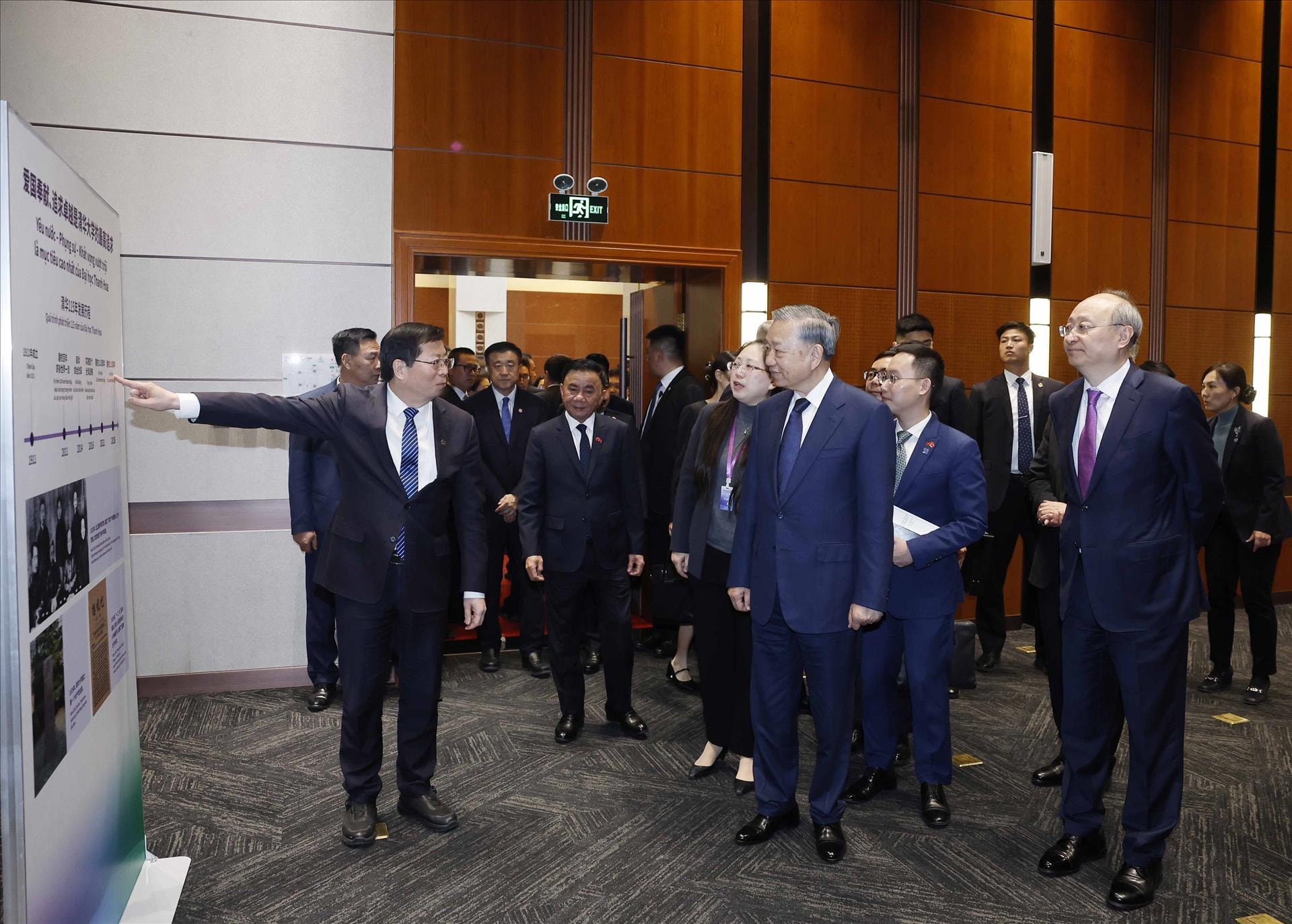 Tổng Bí thư, Chủ tịch nước Tô Lâm và đại biểu nghe giới thiệu về Đại học Thanh Hoa. Ảnh: TTXVN