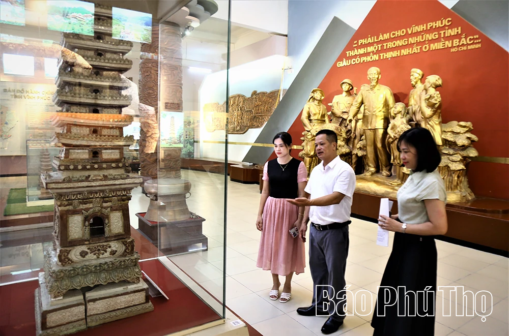 Rời Đền Hùng, chúng tôi đến với Bảo tàng Hùng Vương cơ sở 2 - nơi đang lưu giữ bảo vật Quốc gia Tháp gốm men chùa Trò. Cây tháp này có nguồn gốc từ chùa Trò, mang đậm dấu ấn nghệ thuật thời Trần, khoảng thế kỷ XIV. Tháp có dạng hình trụ vuông rỗng, hiện còn 9 tầng với hoa văn trang trí tinh xảo. Những họa tiết trên thân tháp phản ánh sự hưng thịnh của Phật giáo lúc bấy giờ và sự giao thoa văn hóa giữa người Việt với các nền văn hóa Ấn Độ, Trung Hoa, Chăm Pa, nhưng vẫn giữ vững cốt cách dân tộc.