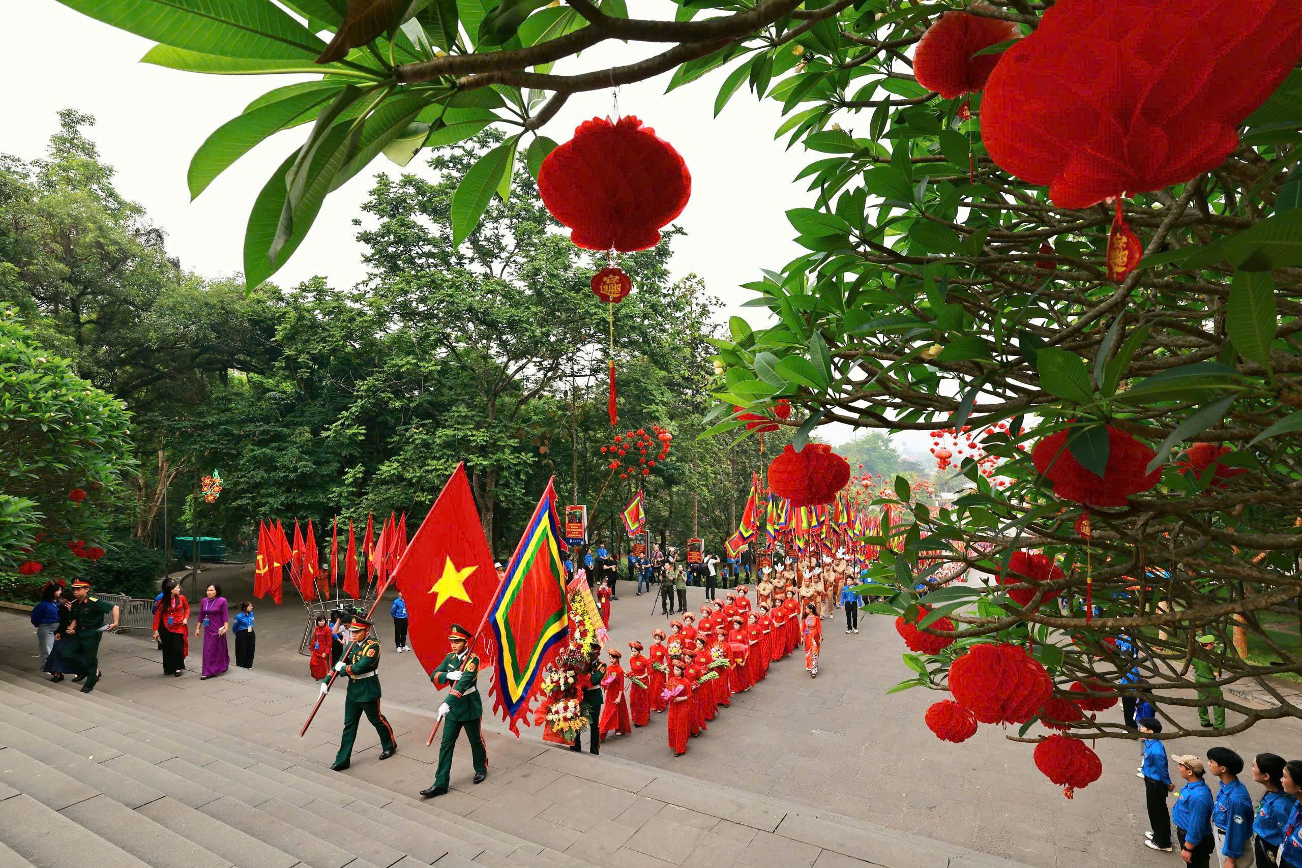 Dẫn đầu đoàn là lực lượng Quân đội Nhân dân Việt Nam trong trang phục chỉnh tề, thực hiện nghi thức rước Quốc kỳ, cờ hội và vòng hoa mang dòng chữ thiêng liêng “Đời đời nhớ ơn các Vua Hùng đã có công dựng nước”. Hình ảnh lá cờ đỏ sao vàng tung bay giữa không gian linh thiêng không chỉ là biểu tượng của chủ quyền quốc gia, mà còn là sự tiếp nối thiêng liêng của lịch sử từ thuở dựng nước đến hôm nay.