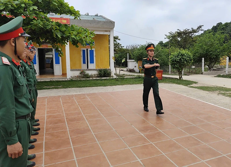 Đại úy Lê Trọng Linh huấn luyện điều lệnh đội ngũ cho các chiến sĩ.