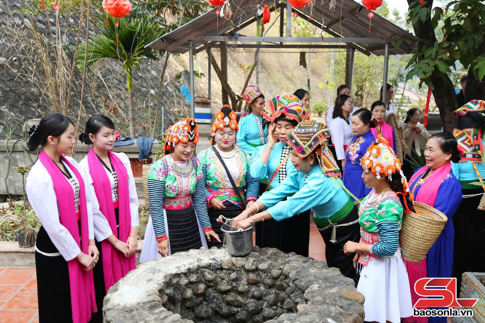 Nhân dân lấy nước cầu may tại giếng Ngọc, Đền Nàng Han, xã Quỳnh Nhai.Ảnh: Lò Linh