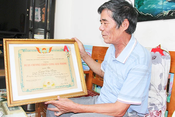 Ông Lương Văn Nhân xem lại những phần thưởng của thời trai trẻ tham gia chiến đấu giải phóng miền Nam, thống nhất đất nước.