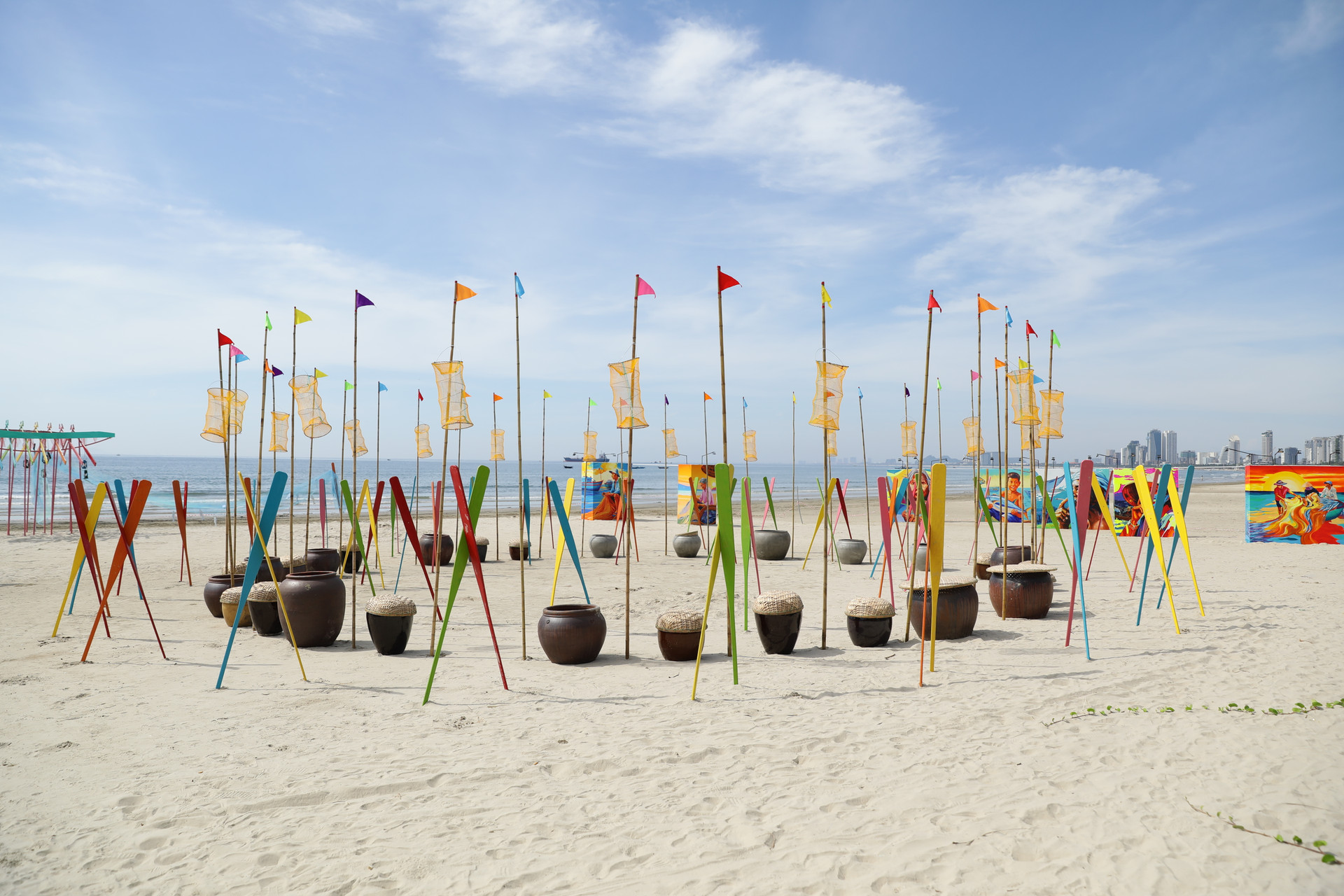 Không gian nghệ thuật sắp đặt "Câu chuyện làng chài" bên bờ biển Mỹ Khê. Ảnh: QUỐC TUẤN