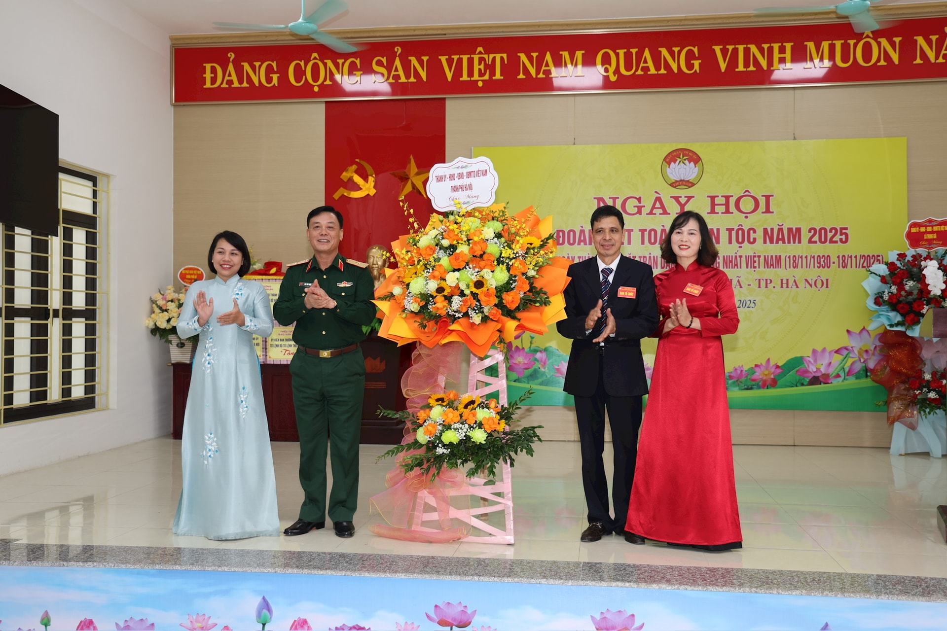 Thiếu tướng Đào Văn Nhận, Tư lệnh Bộ Tư lệnh Thủ đô tặng hoa chúc mừng nhân dân Phố Nỷ, xã Trung Giã. Ảnh: Anh Quang
