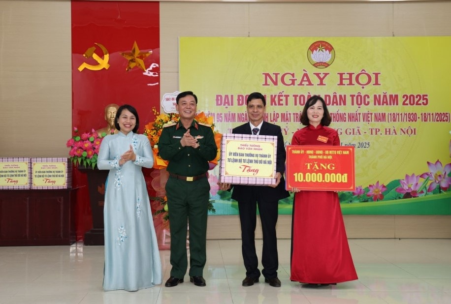Nhân dịp này, thay mặt lãnh đạo thành phố Hà Nội, Thiếu tướng Đào Văn Nhận đã trao tặng 10 suất quà cho 10 gia đình tiêu biểu, có nhiều thành tích trong các cuộc vận động và phong trào thi đua, đóng góp nhiều cho thành tích của thôn, mỗi suất quà trị giá 1 triệu đồng…