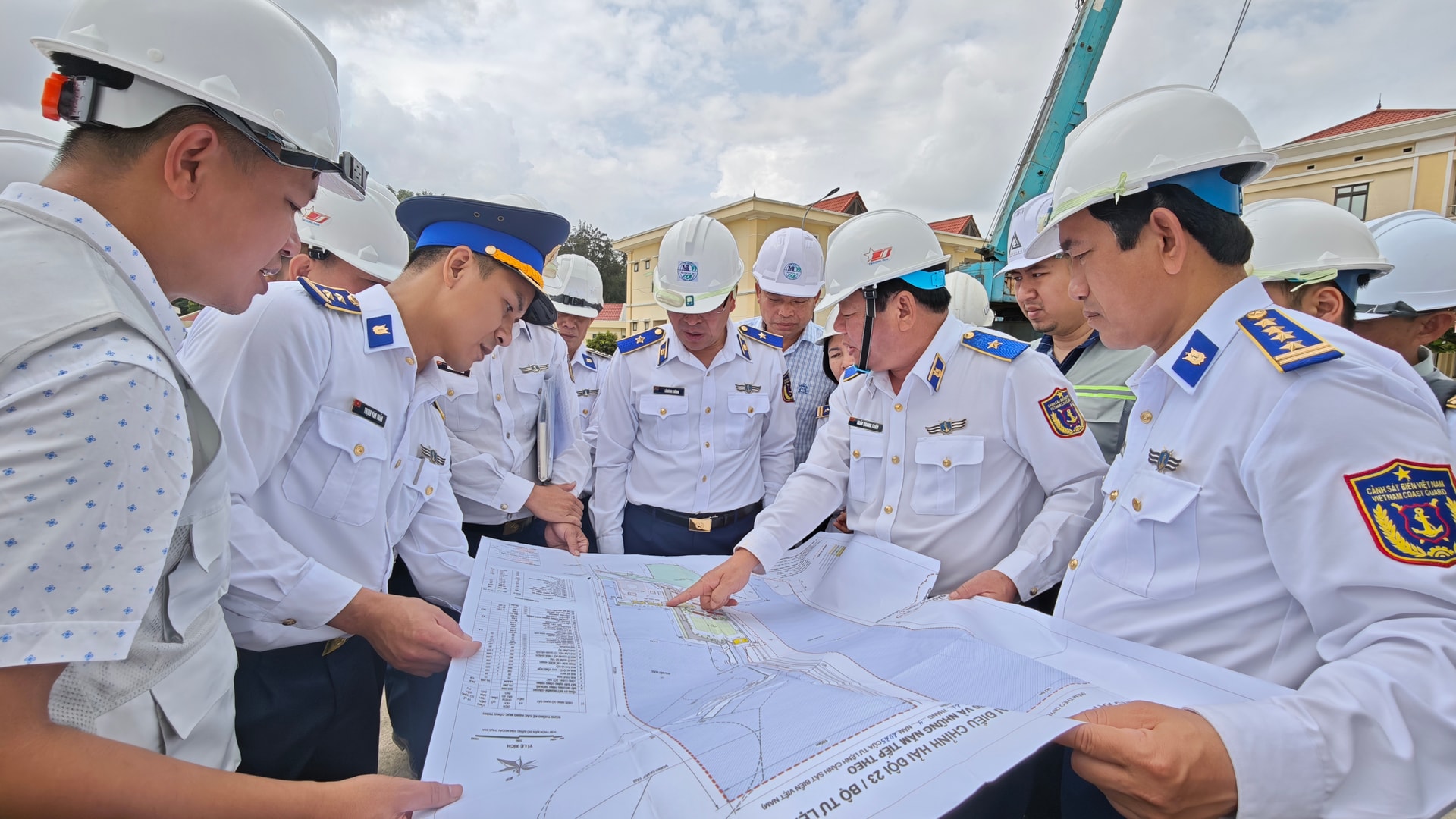 Đoàn công tác khảo sát thực tế một số hạng mục quan trọng như dự án khu neo đậu tàu thuyền, công trình hoàn chỉnh doanh trại Hải đội 23 và kiểm tra, nghiệm thu khối lượng hoàn thành dự án di chuyển cơ quan Bộ Tư lệnh Vùng Cảnh sát biển 2.