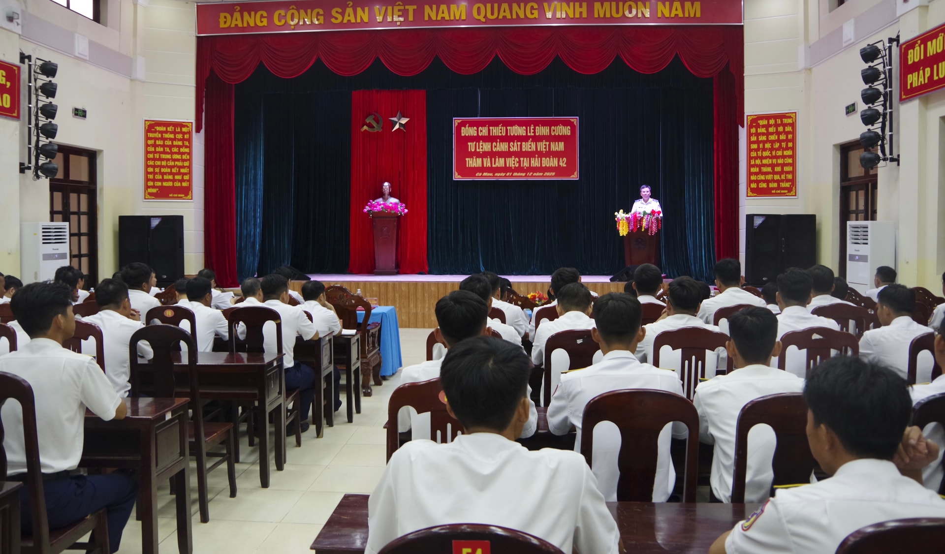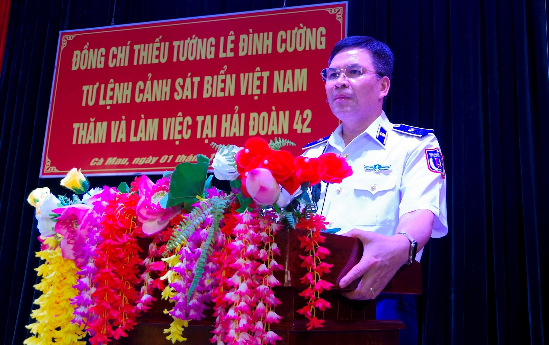Thiếu tướng Lê Đình Cường đánh giá cao, biểu dương những nỗ lực, cố gắng của cán bộ, chiến sĩ Hải đoàn 42 trong công tác SSCĐ, tổ chức và triển khai nghiêm túc Chỉ thị số 9916/CT-BTL ngày 18/11/2025 của Tư lệnh Cảnh sát biển về mở đợt cao điểm đấu tranh phòng, chống tội phạm, ma túy, mua bán người; chống buôn lậu, gian lận thương mại và hàng giả dịp trước, trong và sau Tết Nguyên đán Bính Ngọ năm 2026; xây dựng cảnh quan đơn vị xanh - sạch - đẹp.