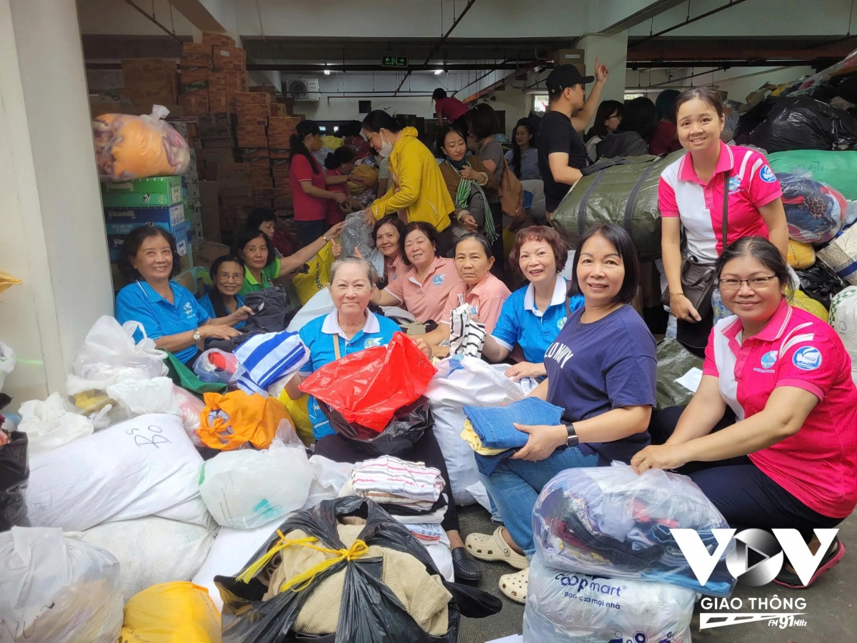 Hội Phụ nữ ở các địa phương hỗ trợ phân loại quần áo và bánh kẹo ủng hộ đồng bào miền Trung (Ảnh: Hồng Lĩnh)