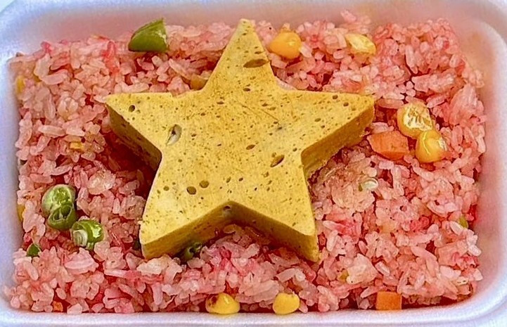 Một sáng tạo khác của quán cũng sẽ mang đến cảm giác lý thú cho thực khách, đó là món cơm chay “Tổ quốc trong tim” với tạo hình cờ đỏ sao vàng từ các nguyên liệu rau củ được trồng theo hướng sạch, thân thiện với môi trường.