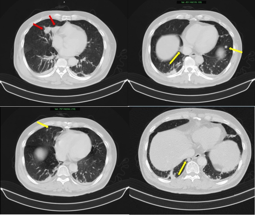 Hình ảnh 2 khối u bờ đa cung ở nhu mô thùy giữa phổi phải, dính vào màng phổi trung thất (mũi tên đỏ) kèm nhiều nốt đặc nhỏ rải rác nhu mô phổi hai bên (mũi tên vàng) gợi ý tổn thương thứ phát. Ảnh: BVCC.