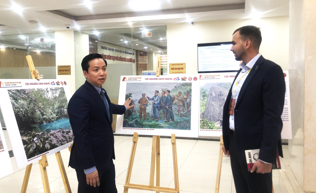 Ngay từ đầu giờ chiều, không khí sôi nổi tại Hội trường Văn Khoa, Đại học KHXH&NV đã vượt ra ngoài khuôn khổ một hội thảo khoa học thông thường. Sảnh chính được bài trí trang trọng với những pano lớn giới thiệu lãnh tụ Nguyễn Ái Quốc chọn Pác Bó, Cao Bằng làm nơi trở về nước, khẳng định tầm nhìn chiến lược của Đảng dẫn dắt toàn dân tộc đứng lên đấu tranh giành độc lập dân tộc thành công, khai sinh ra nước Việt Nam dân chủ cộng hòa. Những bức tranh sinh động tái hiện hình ảnh lãnh tụ Nguyễn Ái Quốc mặc quần áo dân tộc Nùng giản dị và các đồng chí cán bộ cách mạng trở về nước - nơi Cột mốc 108 tại Pác Bó, Cao Bằng; bức tranh Người ngồi dịch sử Đảng bên bàn đá đầu nguồn suối Lê-nin hòa mình với thiên nhiên, của họa sĩ Trịnh Phòng… Không gian ấy - “tiền sảnh ký ức”, dẫn dắt đại biểu tham dự bước chậm lại, lắng sâu hơn để tìm hiểu về Pác Bó với Chủ tịch Hồ Chí Minh trước khi bước vào đối thoại học thuật.