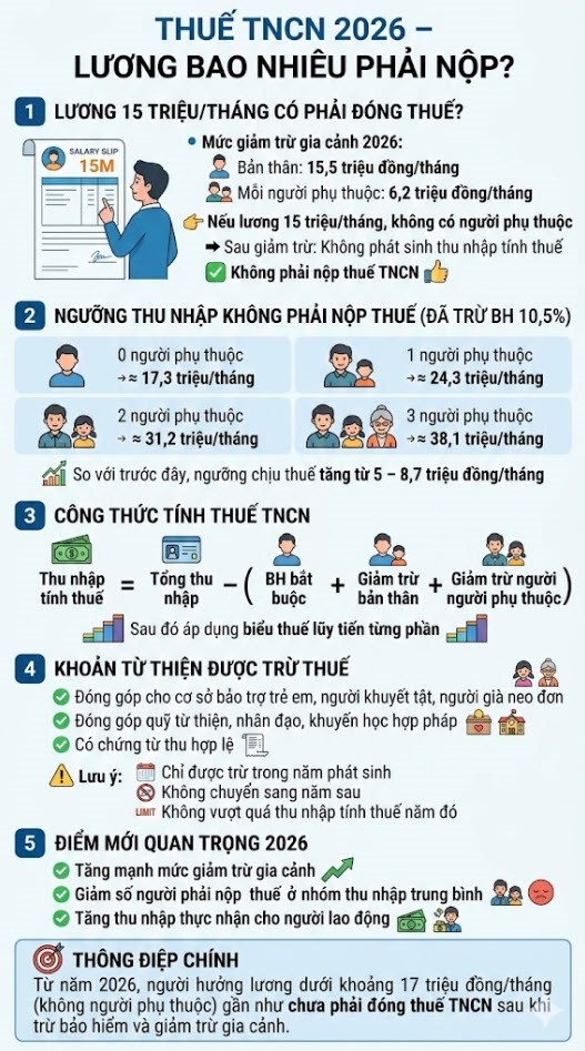 Kết luận: Lương 15 triệu/tháng năm 2026 không phải đóng thuế TNCN (nếu không có người phụ thuộc và không có thu nhập chịu thuế khác).