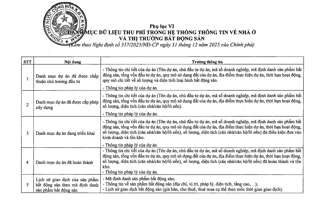 Phụ lục VI Nghị định 357 quy định dữ liệu thu phí. Khi trả phí, người dân được tra cứu thông tin chi tiết về dự án, mã định danh, pháp lý và lịch sử giao dịch, giúp kiểm chứng độc lập trước khi mua nhà, giảm rủi ro.