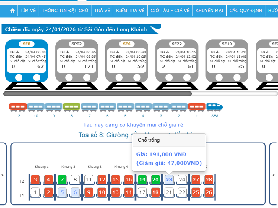 Trên hệ thống vé tàu điện tử sẽ hiển thị các chỗ có vé giảm giá bằng màu xanh nhạt, khi đưa con trỏ vào vị trí này sẽ hiện vé nguyên giá và mức giảm giá.