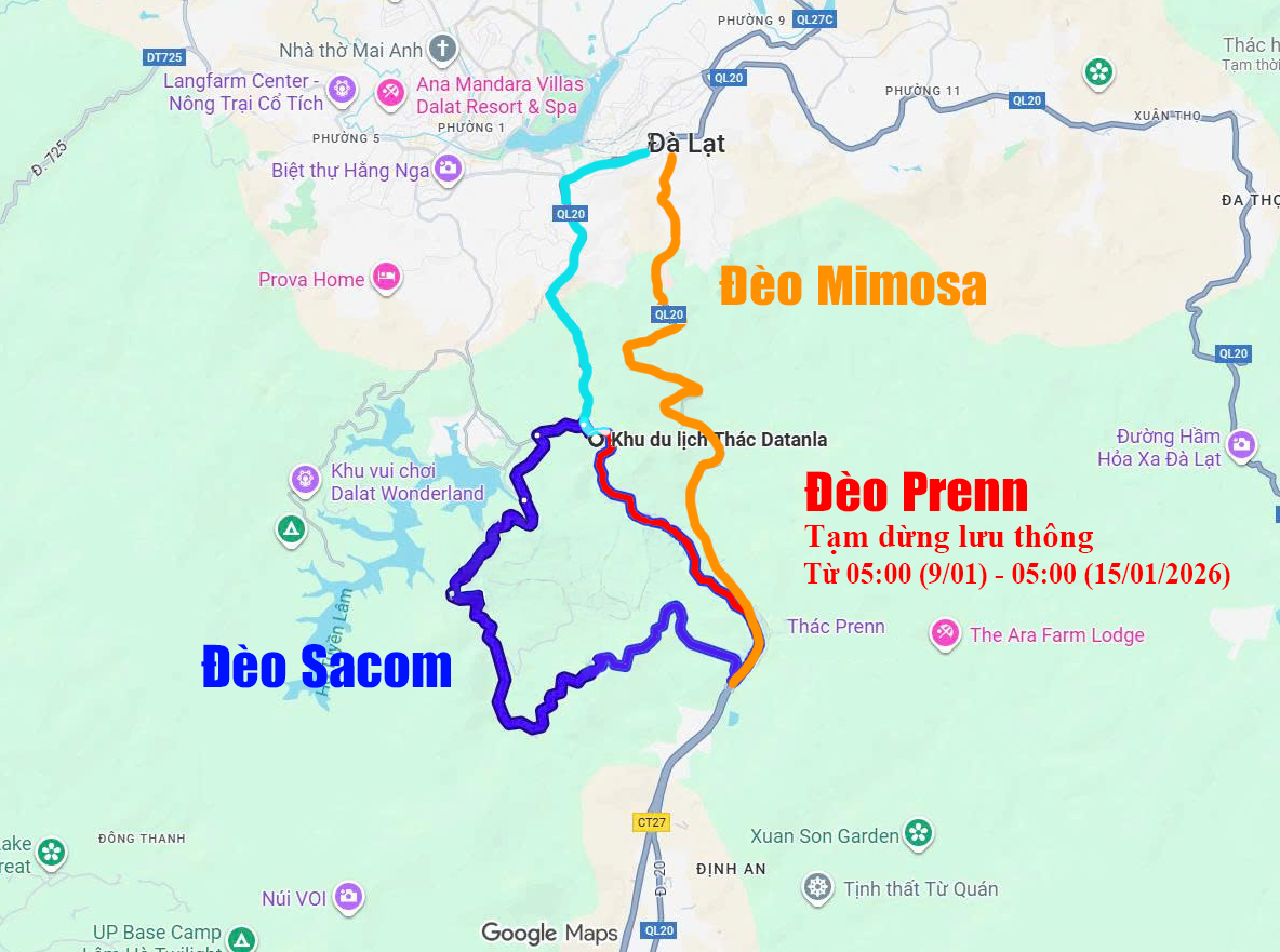 Đèo Sacom và Đèo Mimosa là các tuyến đường thay thế đoạn Đèo Prenn trong thời gian tạm dừng lưu thông