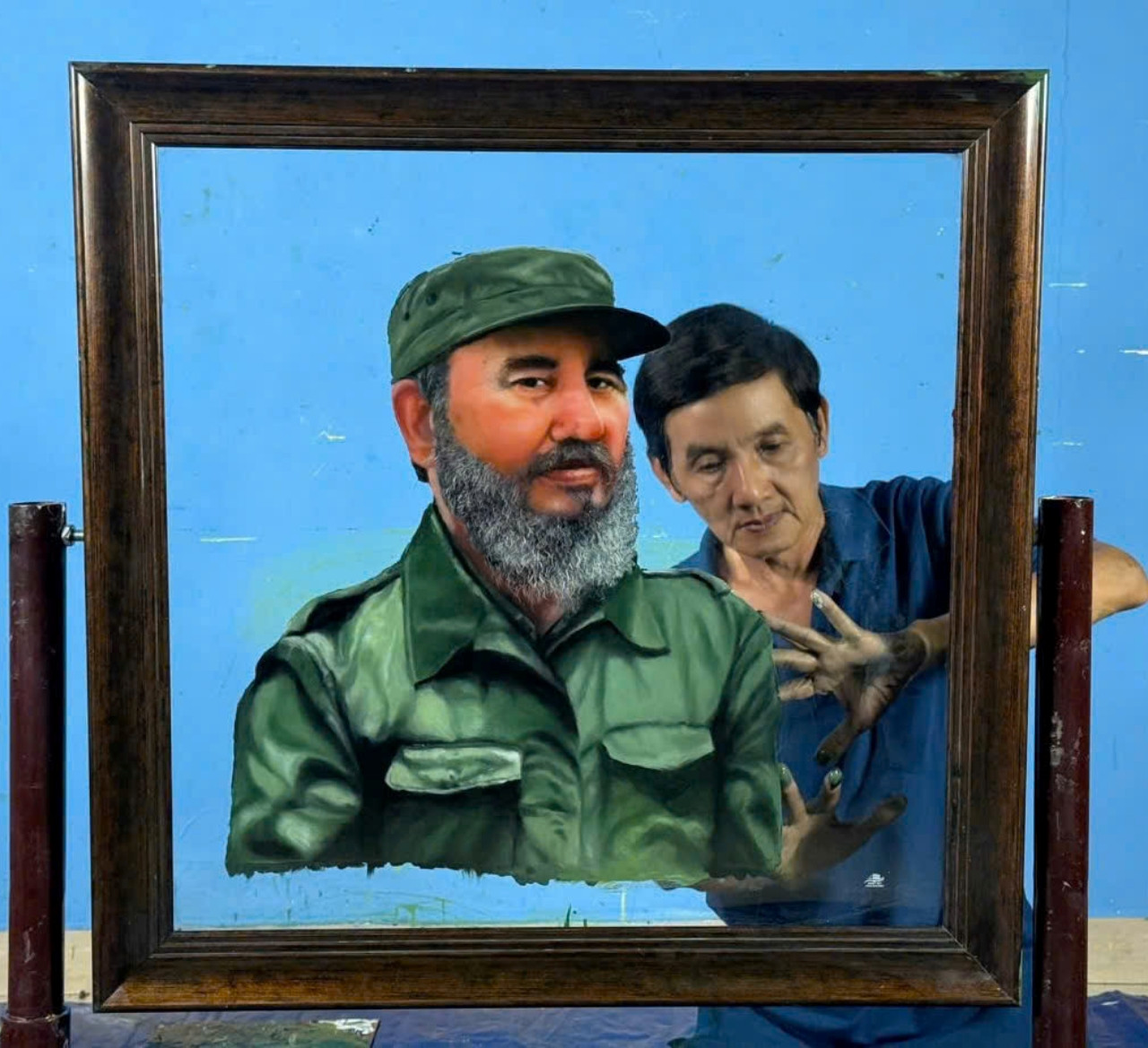 Họa sĩ, kỷ lục gia thế giới Đoàn Việt Tiến giới thiệu tác phẩm vẽ chân dung ông Fidel Castro của mình. Ảnh: Hà Nguyễn