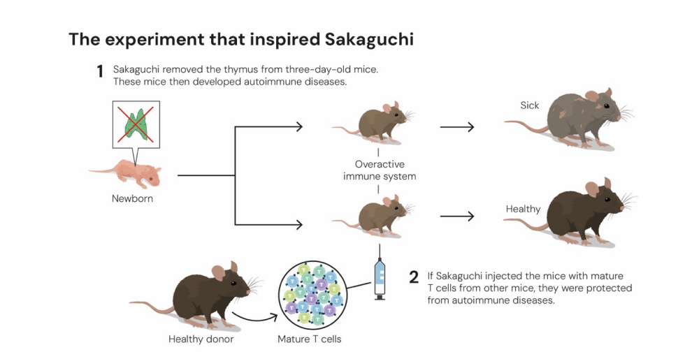 Từ thí nghiệm cắt bỏ tuyến ức trên chuột con, ông Sakaguchi nhận thấy những con bị mất cơ quan này sớm phát triển hàng loạt bệnh tự miễn, dấu hiệu cho thấy hệ miễn dịch đã “vượt kiểm soát”.