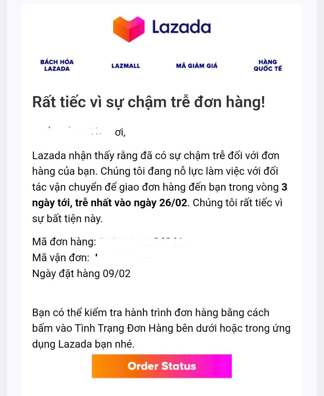 Email thông báo từ Lazada về sự chậm trễ đơn hàng sau 2 tuần đặt hàng.